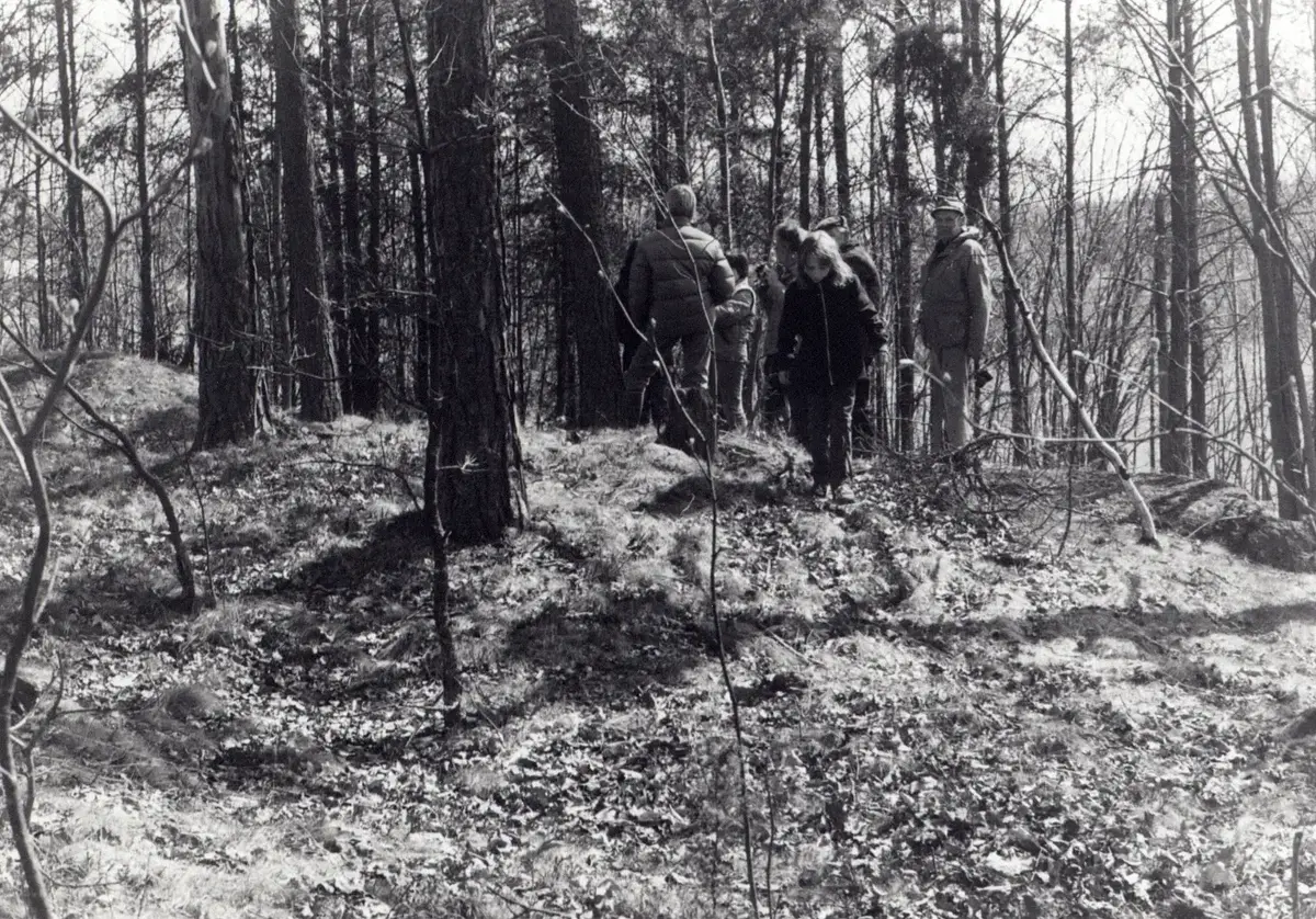 Grävningsplatsen fornlämning 23 Skäve, Järna socken besöks av några kursdeltagare inför 1980 års arkeologikurs.