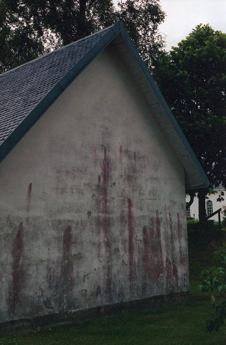 Putsat bårhus vid Vårviks kyrka, angrepp av rödalg.