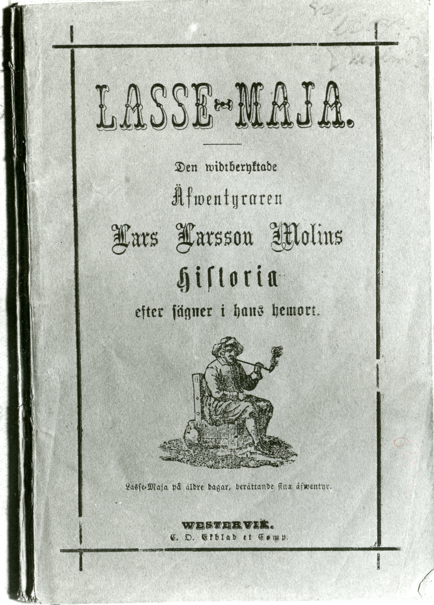 Avfotograferad framsida av biografin "Lasse-Maja - Den widtberyktade Äfwentyraren Lars Larsson Molins historia efter sägner i hans hemort".