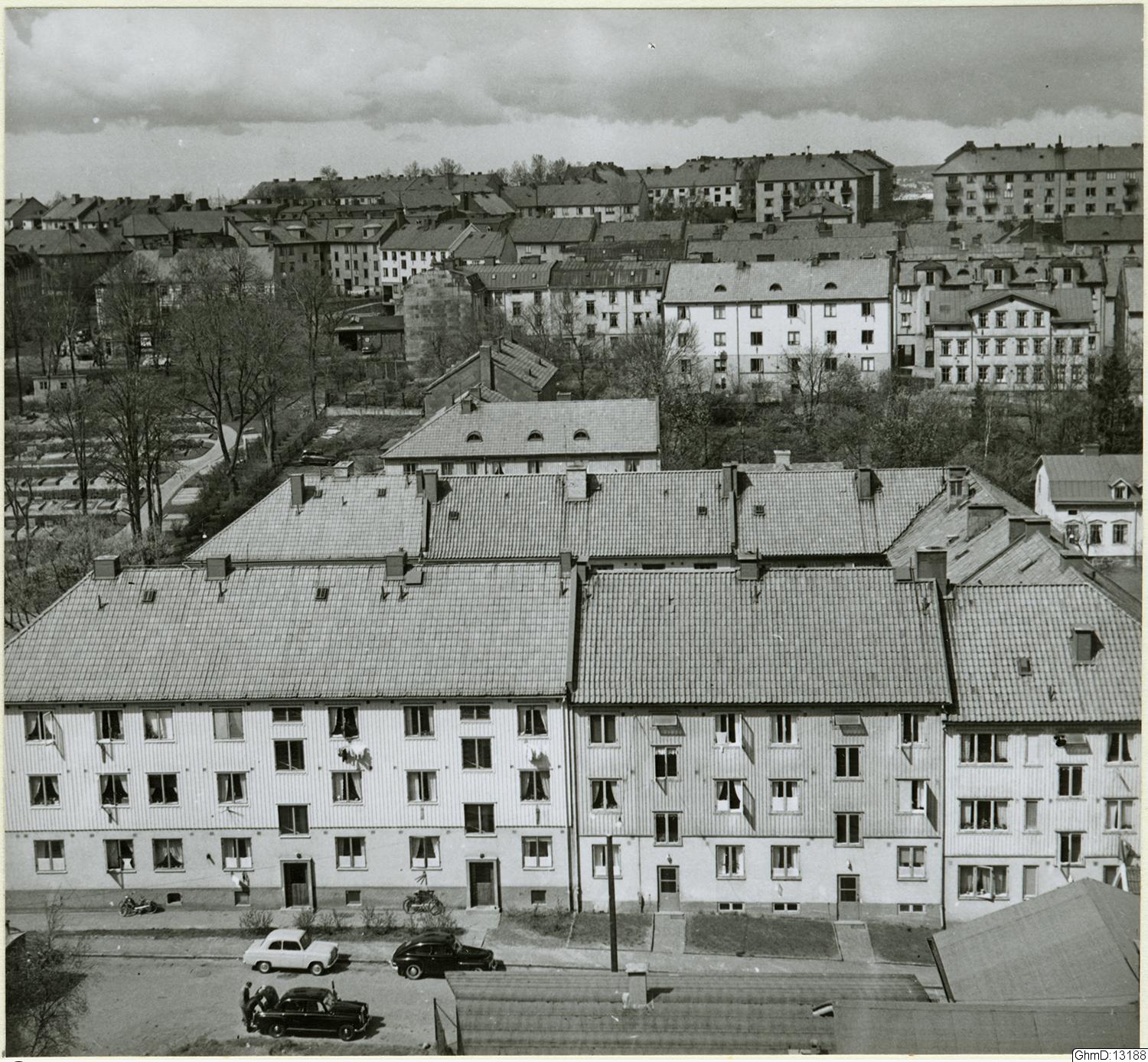 Blick mot sydväst från höjderna vid Danska vägens östra sida, mitt emot Tåns kyrkogård till vänster i bild. Bakom bostadshusen skymtar en redskapsbod tillhörande kyrkogården.