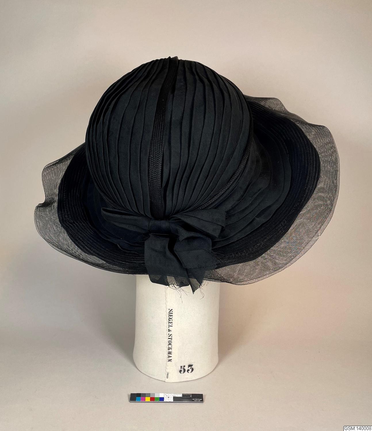 Beskrivning: Sorghatt av svart krenol (modistterm för glesvävt stelt material ursprungligen av hästtagel) med draperingar av tunt svart tyg. Hatten är i en modell som burits sedan sent 1910-tal och kommer att fortsättas att bäras även under 1920 talets andra hälft även om den kommer att vara mindre vanlig än klockhatten/skopan som oftast upplevs som mest typisk för 1920 talet. Hatten samhör med Sorgkappan GSM:140007. Kappan och hatten är med stor sannolikhet anskaffade och använda 1924 när först Tyra Hjertmans svärfar , och så hennes far går bort under året; följande år avlider även Tyra Hjertmans mor. Ägarinnan var född 1881 så hon är lite över 40 år 1924; hon och maken som är typograf bor sedan 1918 på Amiralitetsgatan i Majorna i Göteborg . Familjen har sju barn och givarens far är yngst. För att se fotografier från 1924 med medlemmar ur familjen Hjertman gå till post U:970 i databasen Carlotta.