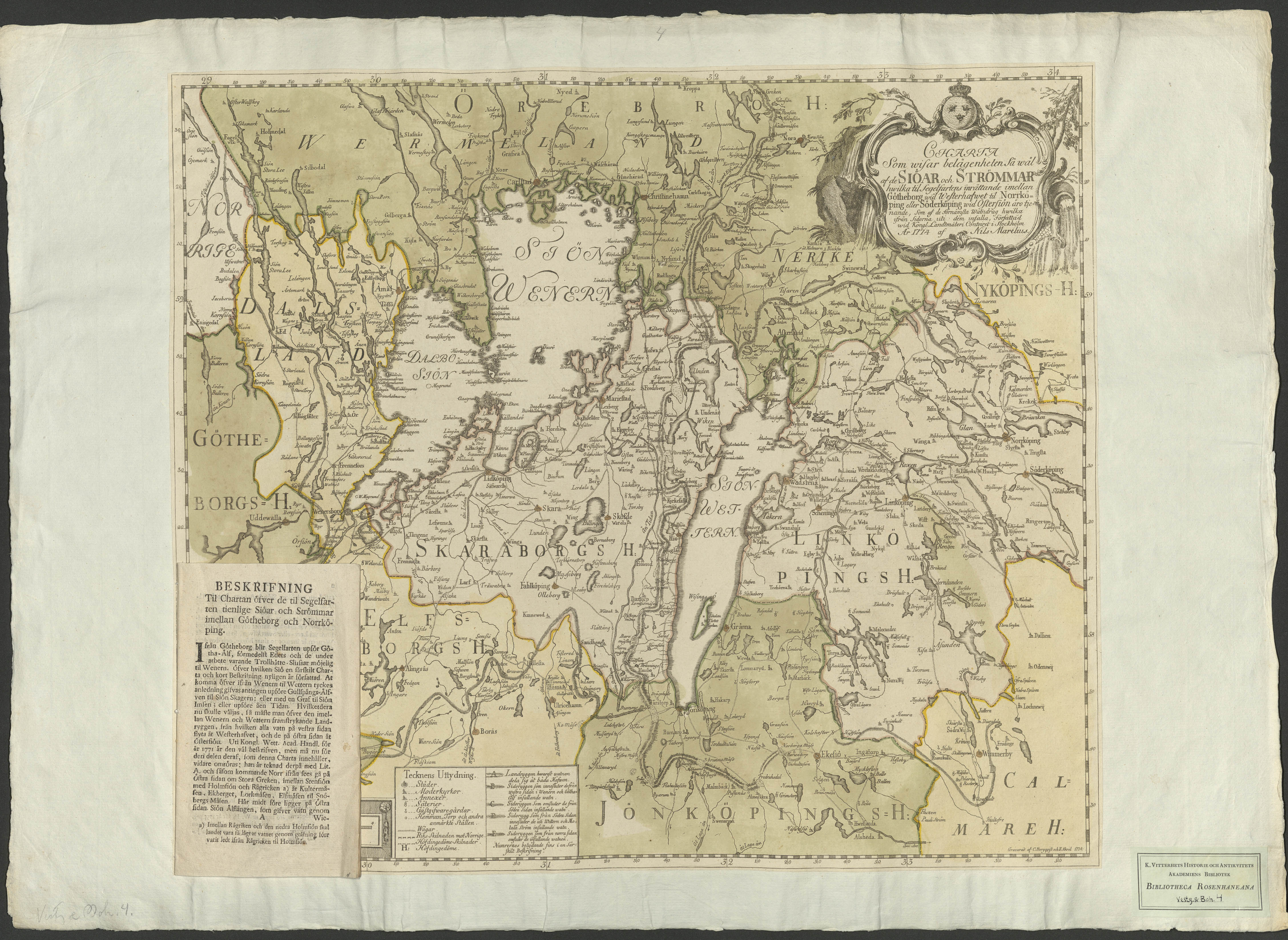 Beskrivning: 1 karta + Topografisk karta som täcker delar av Svealand. Producerad inför planerna på Göta kanal. Vidhängande beskrivning i häfte om åtta blad. Graverad af C. Bergquist och F. Akrel 1774