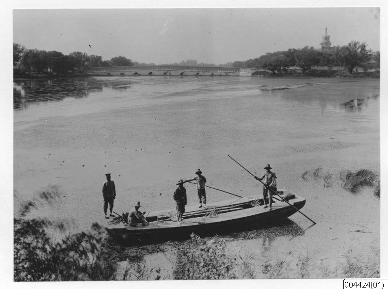 Beihai. Fem män i en liten båt på Baihaisjön. I bakgrunden The Bridge of Everlasting Peace och den vita dagoban.