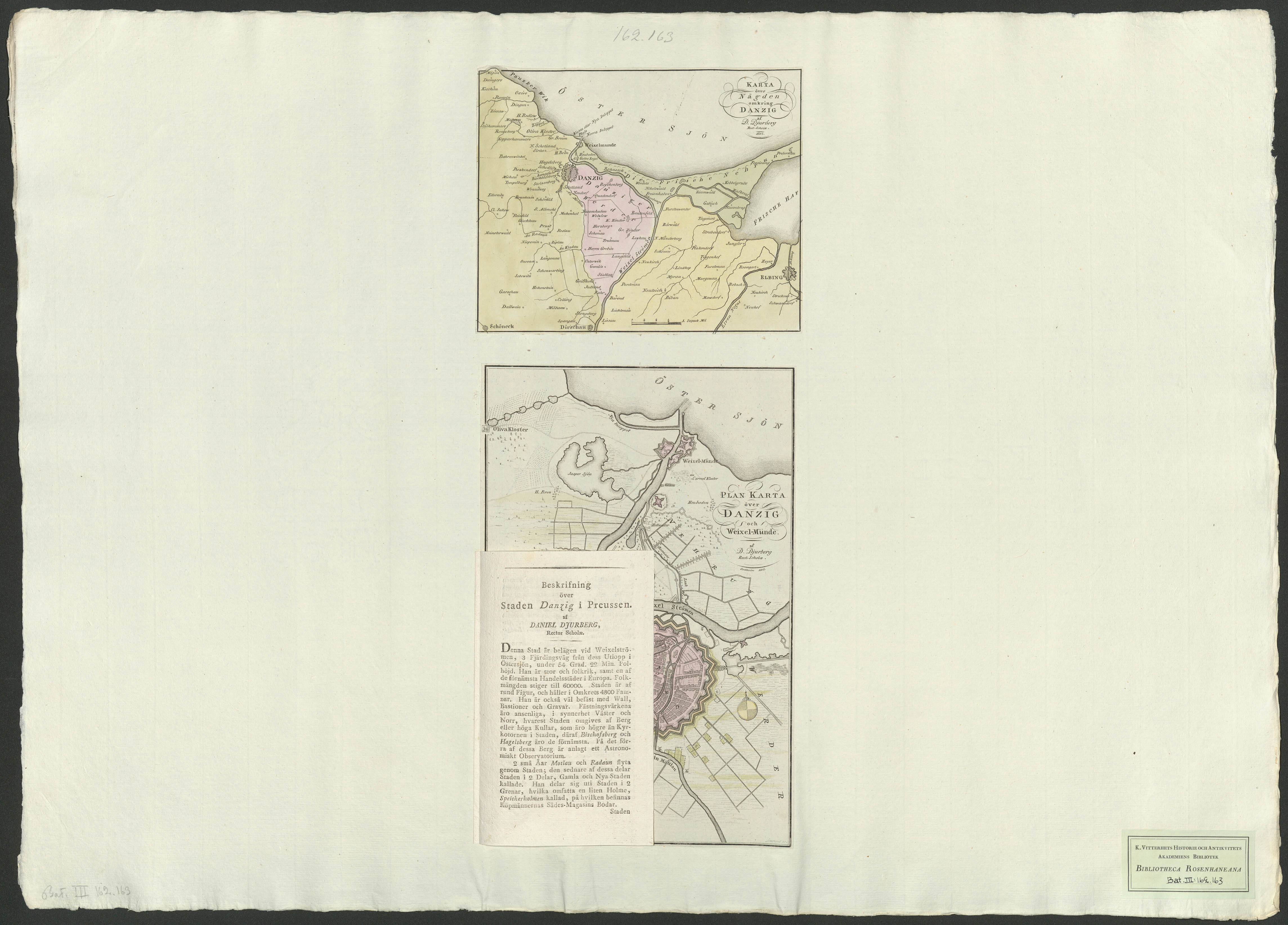Beskrivning: 1 karta : Visar trakten kring Danzig med orter och vattendrag. af D. Djurberg rect. Scholæ.