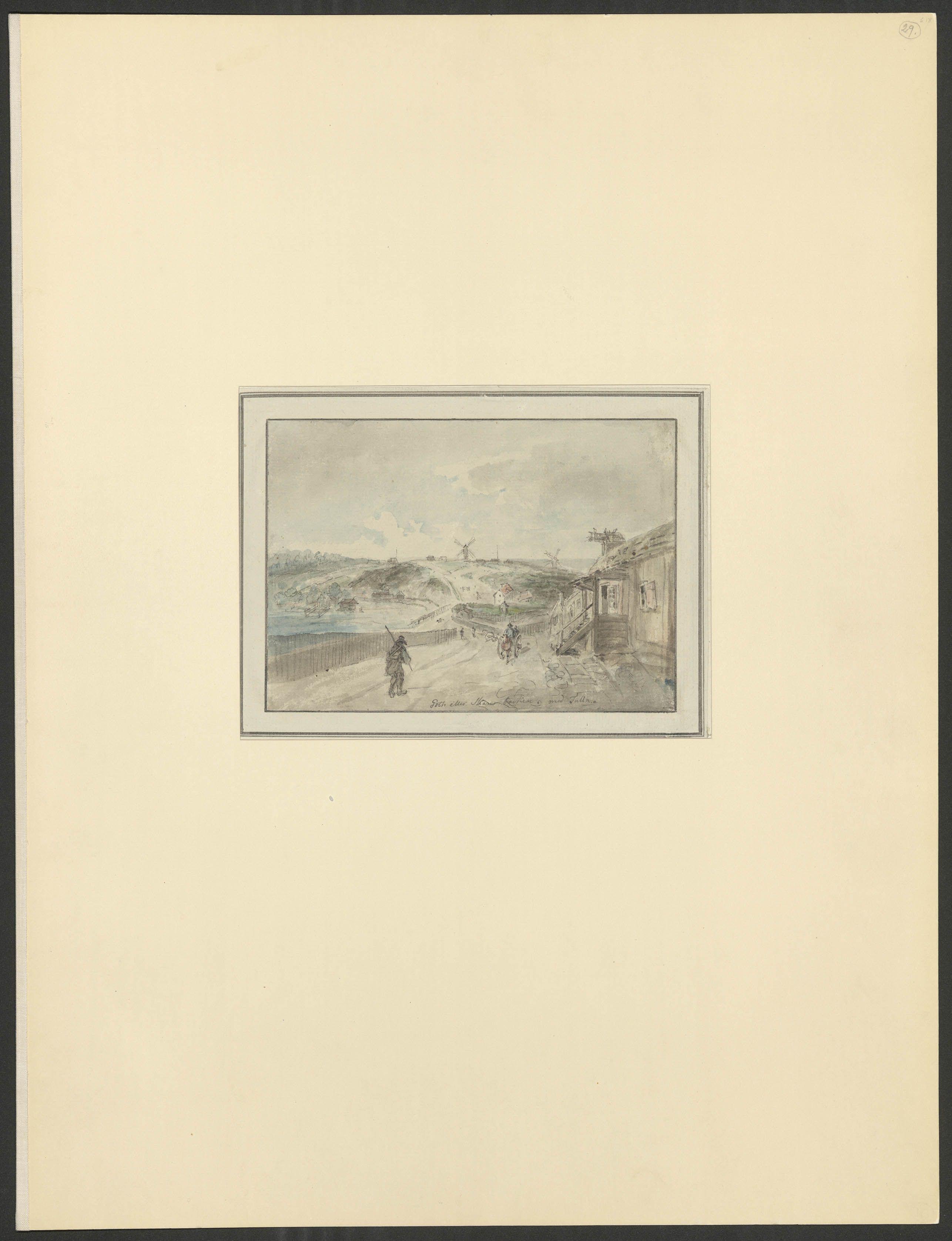 Beskrivning: 1 bl. : Backen sedd uppifrån i bildens mitt. Till höger låga träkåkar. I bakgrunden syns kvarnar på bergen.