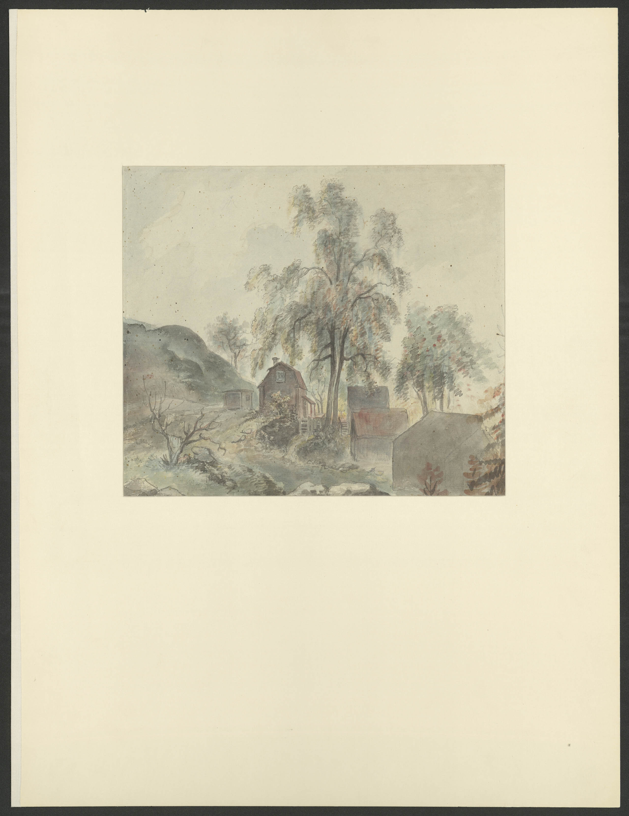 Beskrivning: 1 bl. : Bruksbyggnader, vattenhjul och fors i disiga höstfärger.