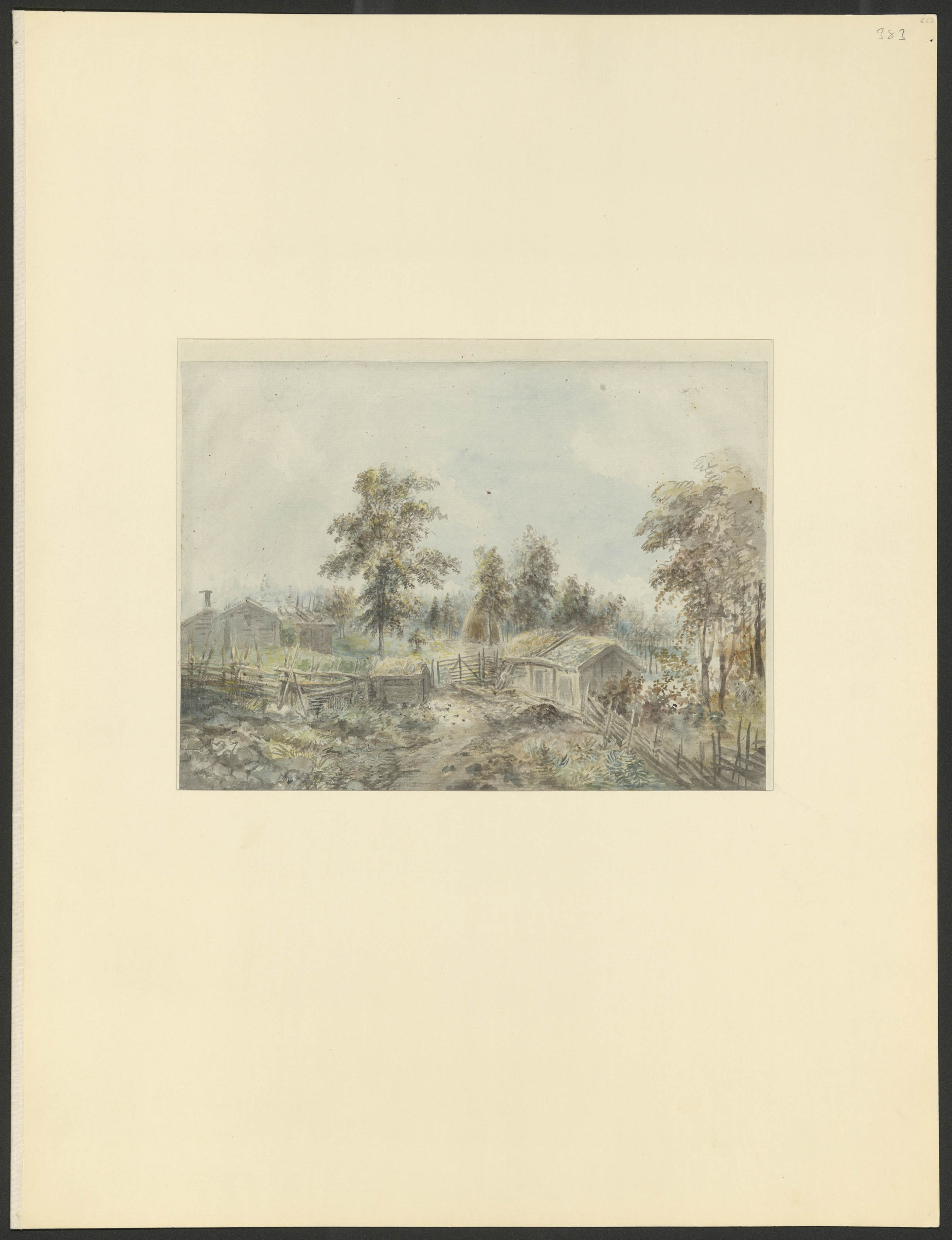 Beskrivning: 1 grafiskt bl. : Ett torpställe på en höjd, med gärdesgårdar, grind och uthus.