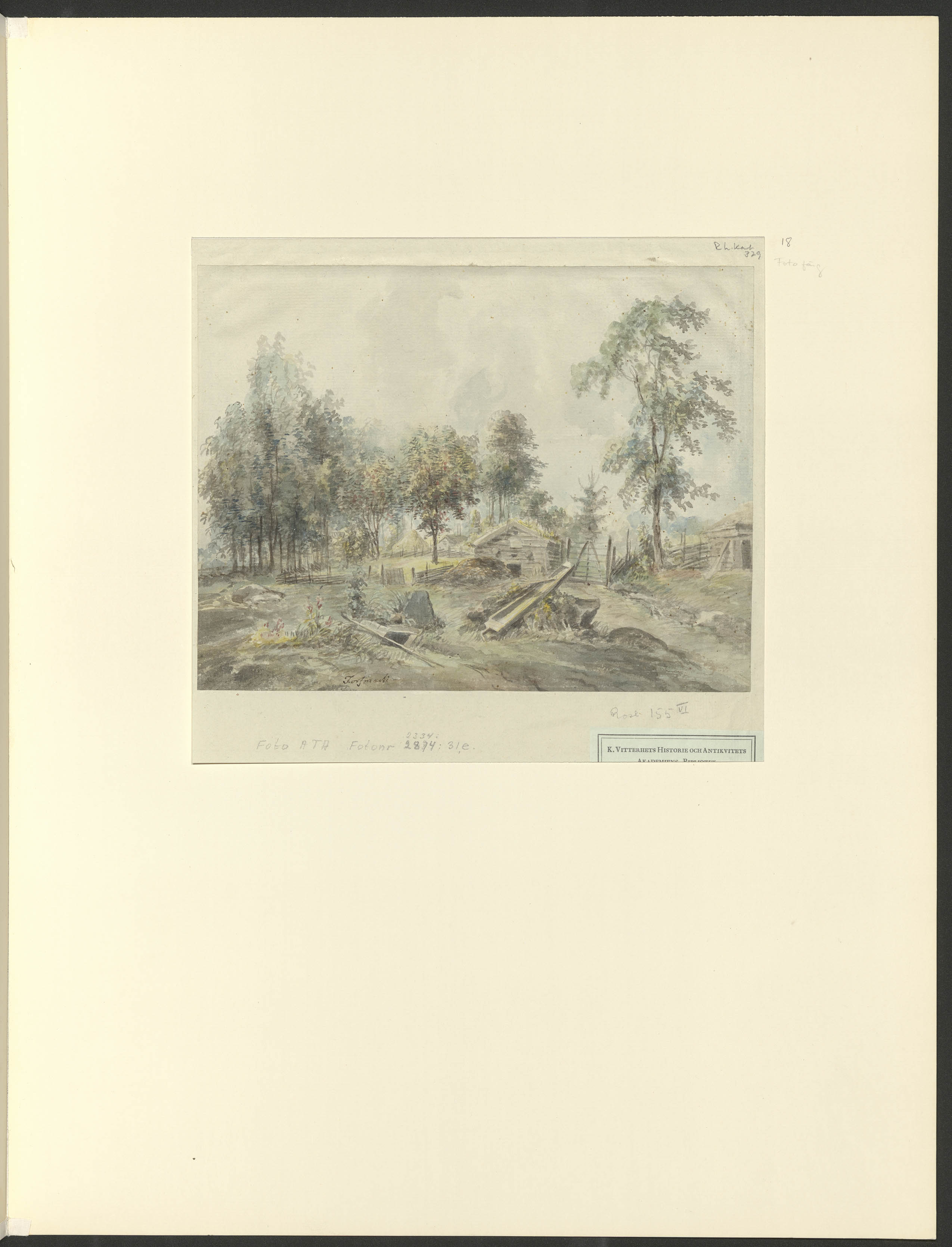 Beskrivning: 1 bl. : Ett torpställe i en glänta. Gärdesgårdar samt i förgrunden en öppen brunn och diverse redskap.