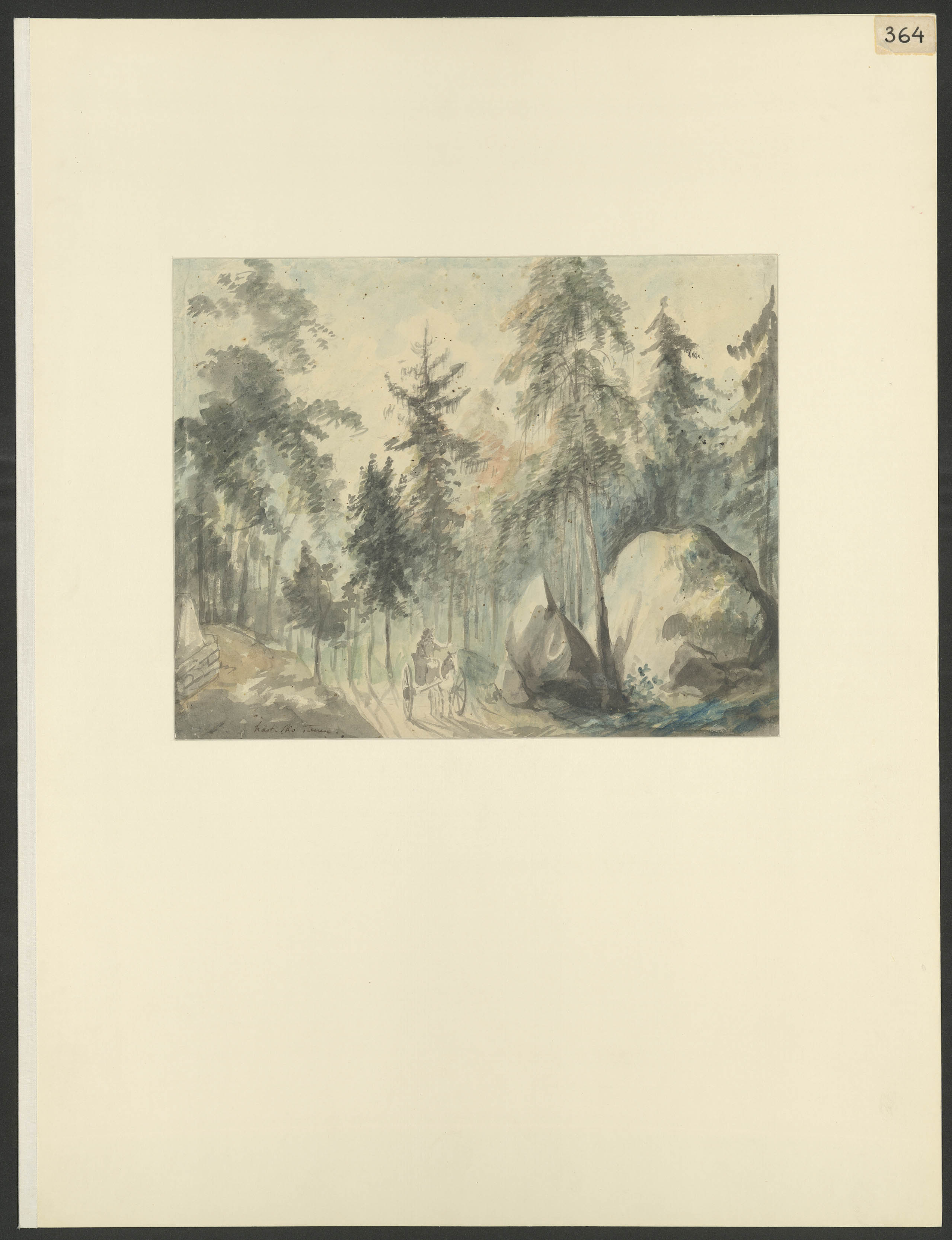 Beskrivning: 1 bl. : Den säreget formade stenen till höger i bild. I mitten går vägen genom barrskog. En man i en trilla har saktat in vid stenen. Till höger en milstolpe.