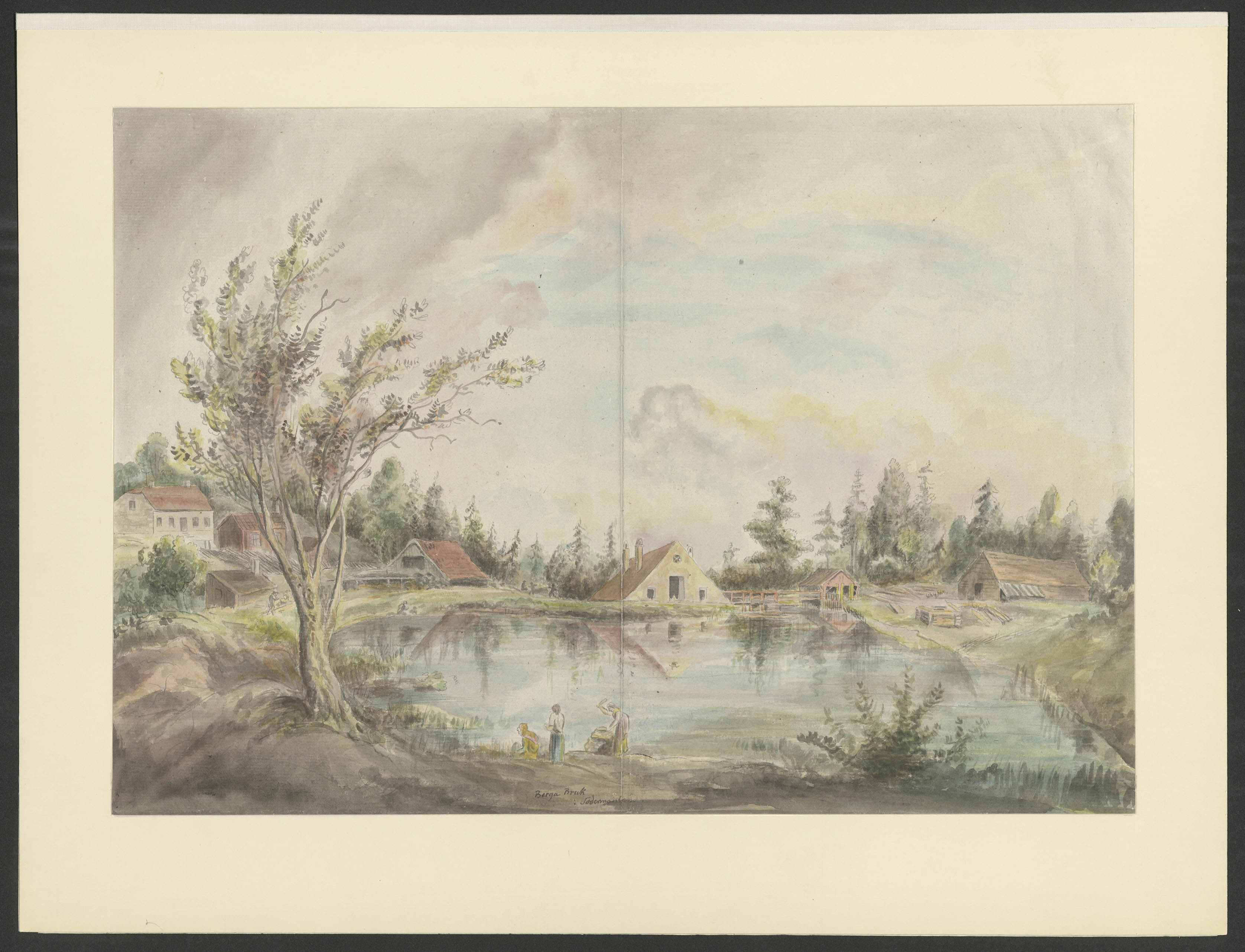Beskrivning: 1 bl. : Vy över bruket. I förgrunden bruksdammen med några kvinnor som tvättar kläder.