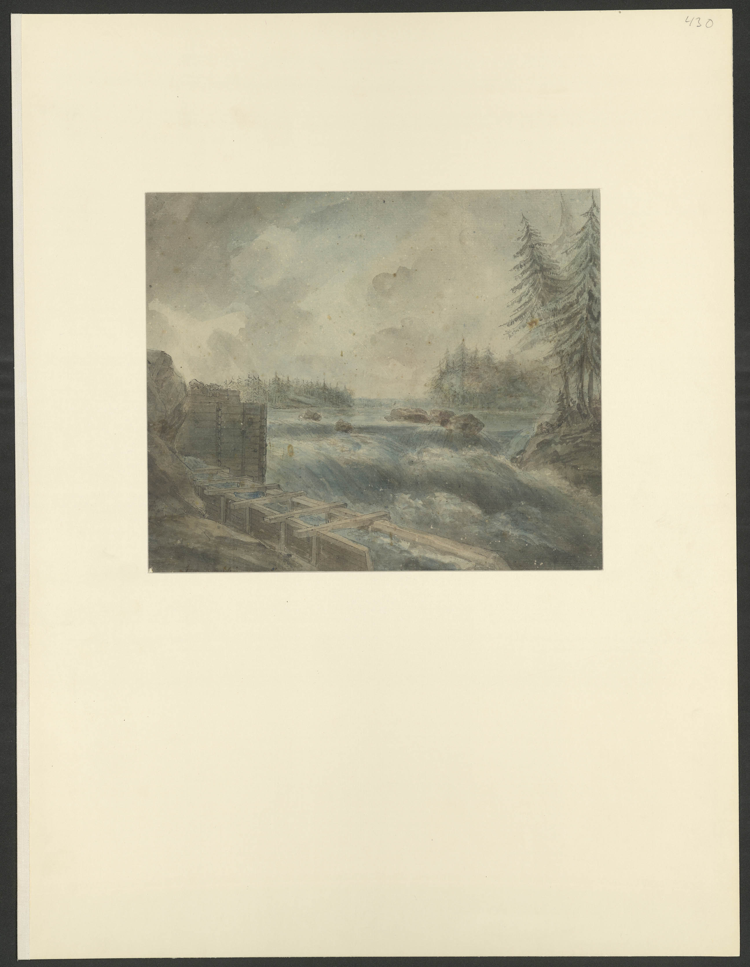 Beskrivning: 1 bl. : Vattenfallet under en mörk himmel. I förgrunden till vänster en timmerränna och andra träkonstruktioner.
