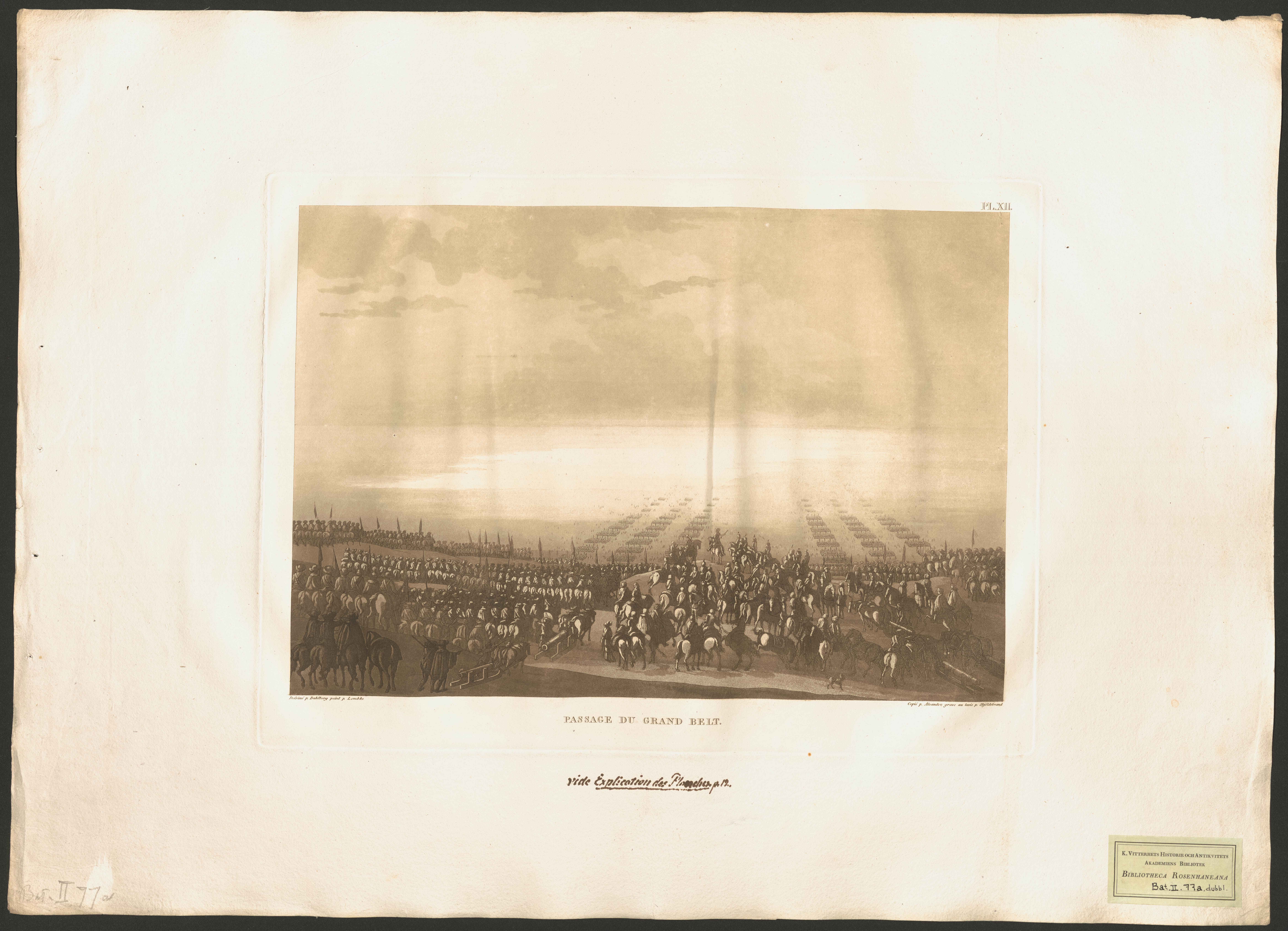 Beskrivning: 1 grafiskt bl. : Panorama över marschen över Stora Bält den 7 februari 1658. I förgrunden kungen i spetsen för en grupp ryttare på väg ut på isen. Dessiné p. Dahlberg, peint. p. Lembke. Copié p Aleander, grave au lavis p Skjöldebrand