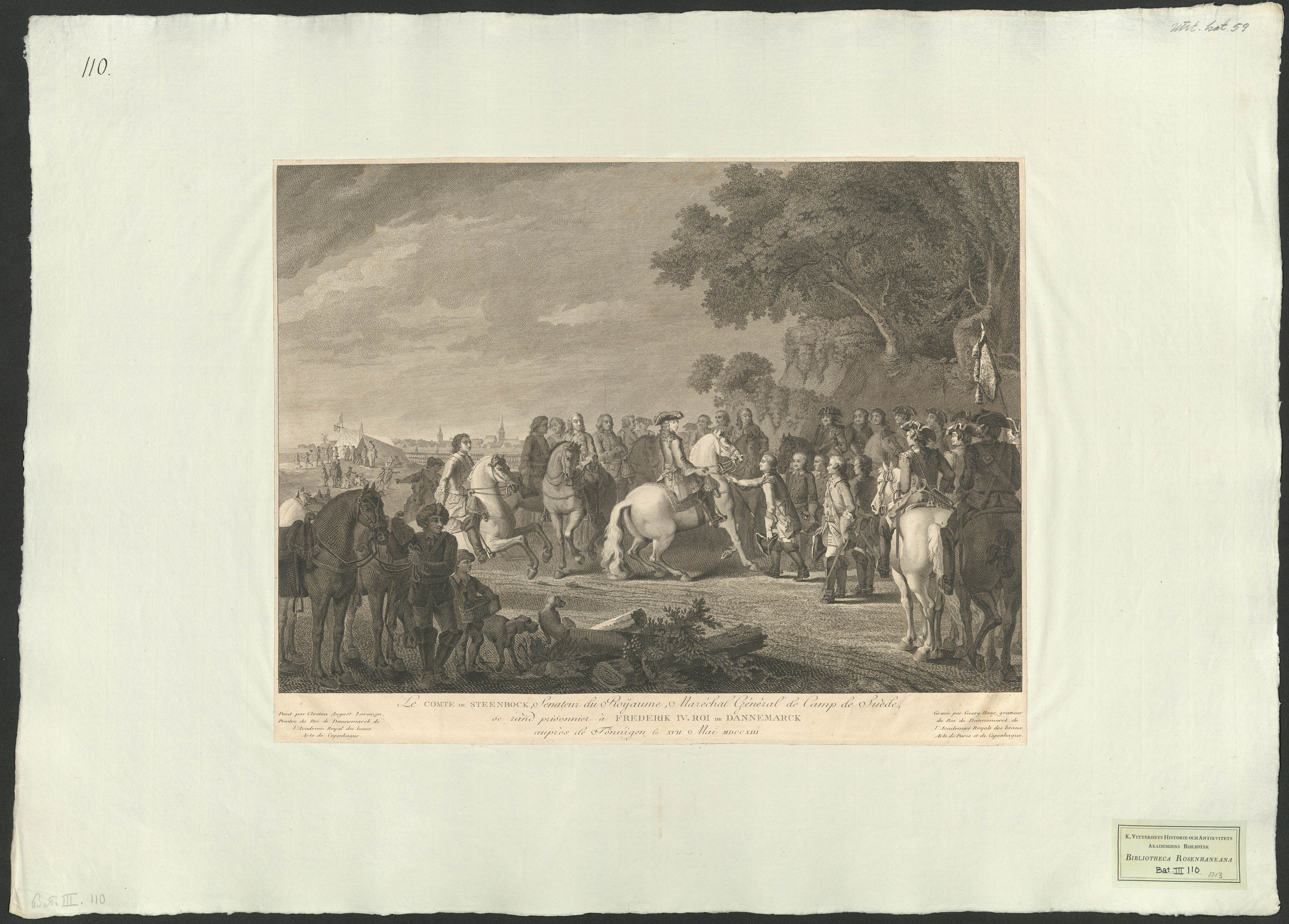 Beskrivning: 1 grafiskt bl. : Danske kungen Fredrik IV till häst i bildens mitt, tar emot den kapitulerande Stenbock. "Peint par Chretien August Lorenzen ; Gravè par Georg Haas ..."