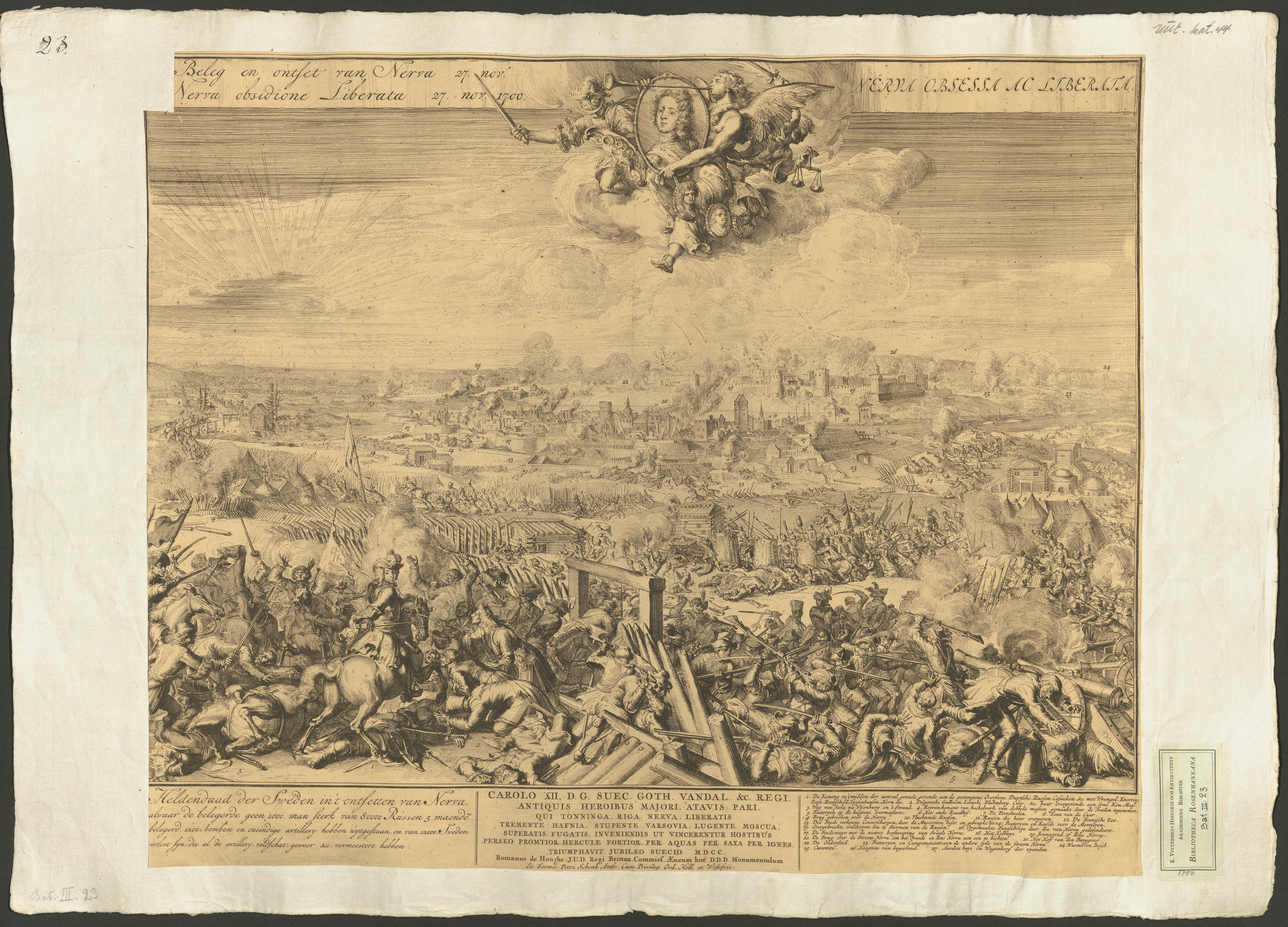 Beskrivning: 1 grafiskt bl. : Panorama över slaget vid Narva. Romanus de Hooghe J.U.D.
