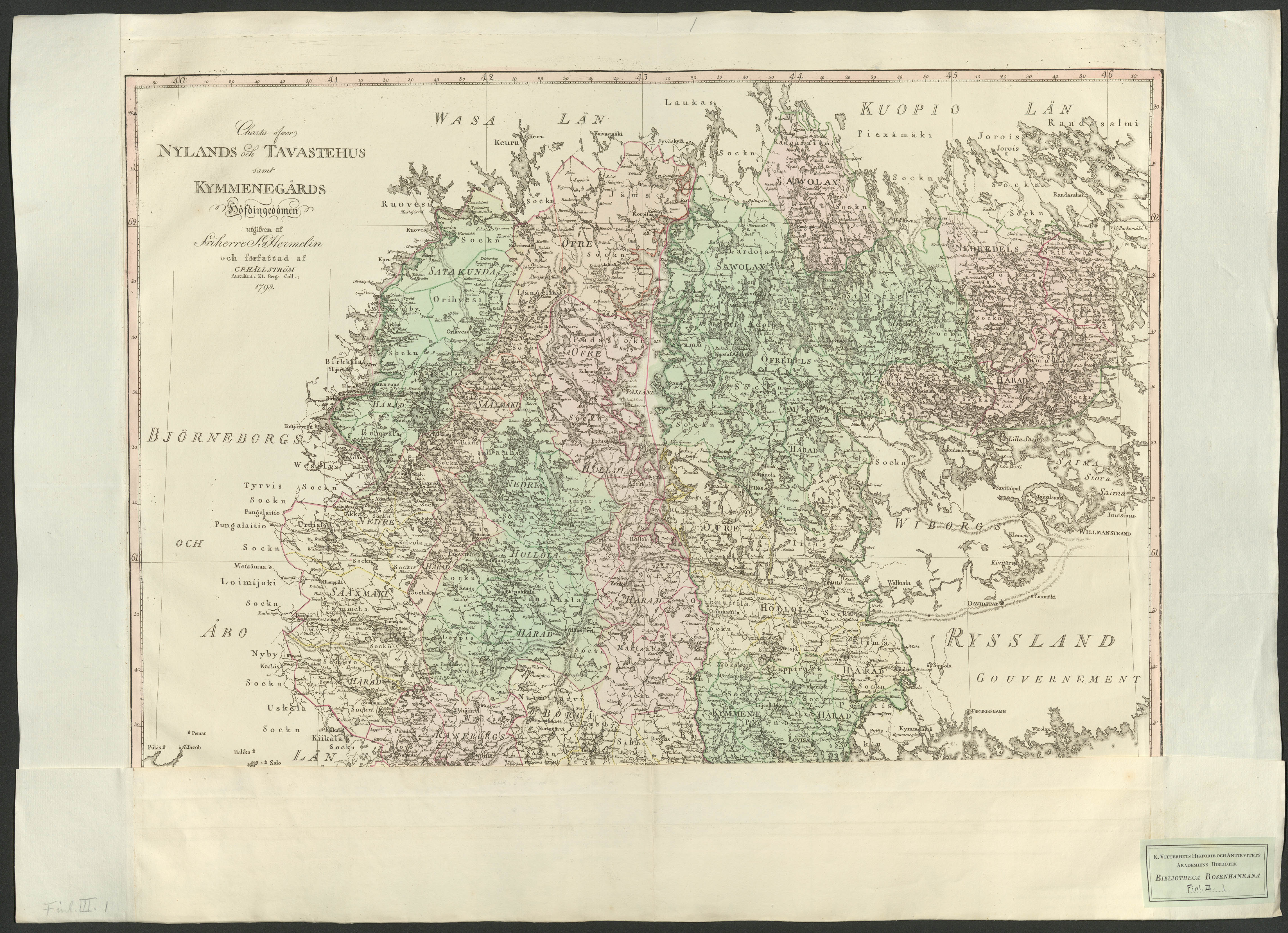 Charta öfwer Nylands och Tavastehus samt Kymmenegårds höfdingedömen.[Kartografiskt material]