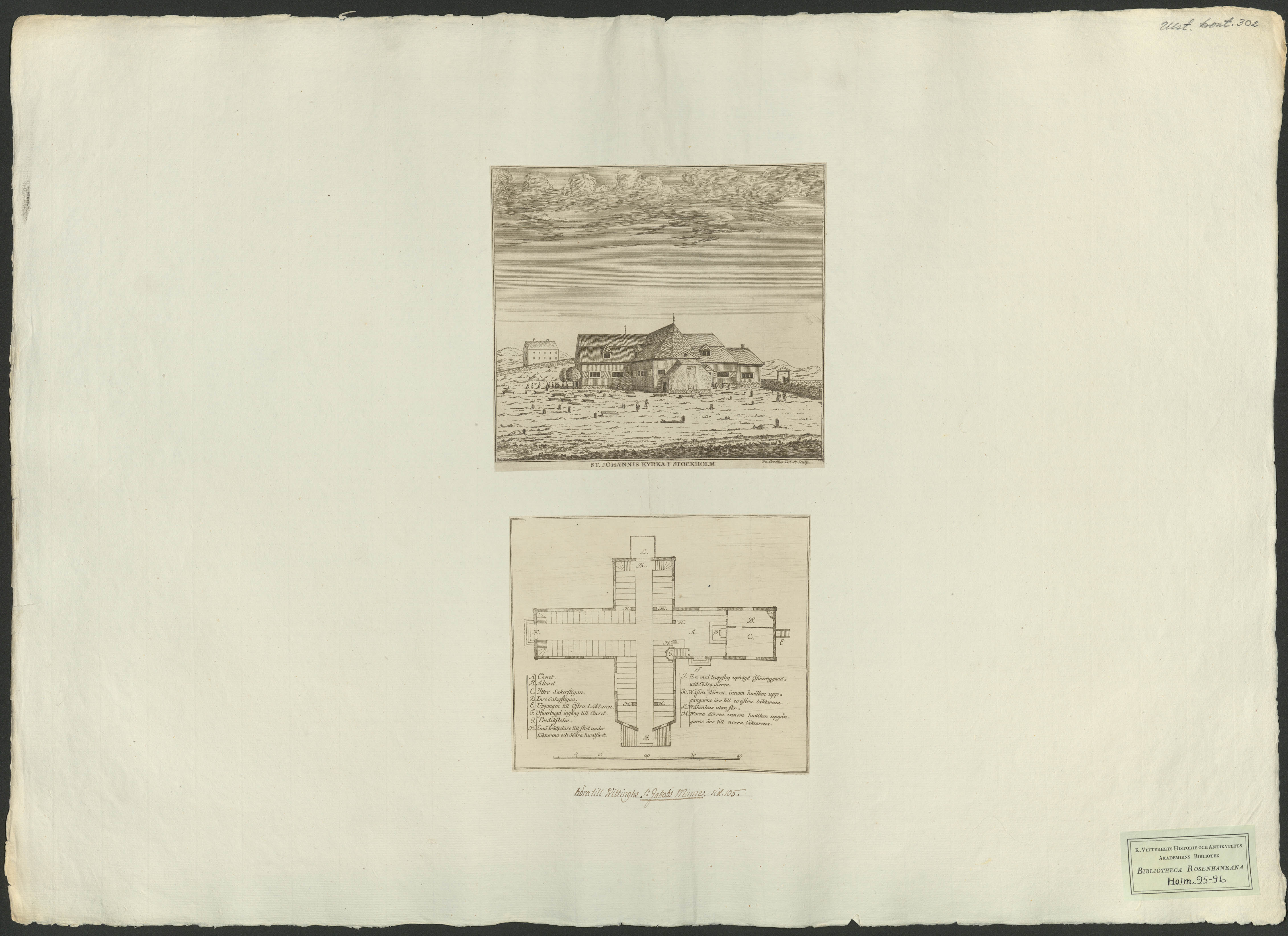 Beskrivning: 1 grafiskt bl. : Teckning av kyrkan med omgivningar. Fr. Akrelius Del. Et Sculp.