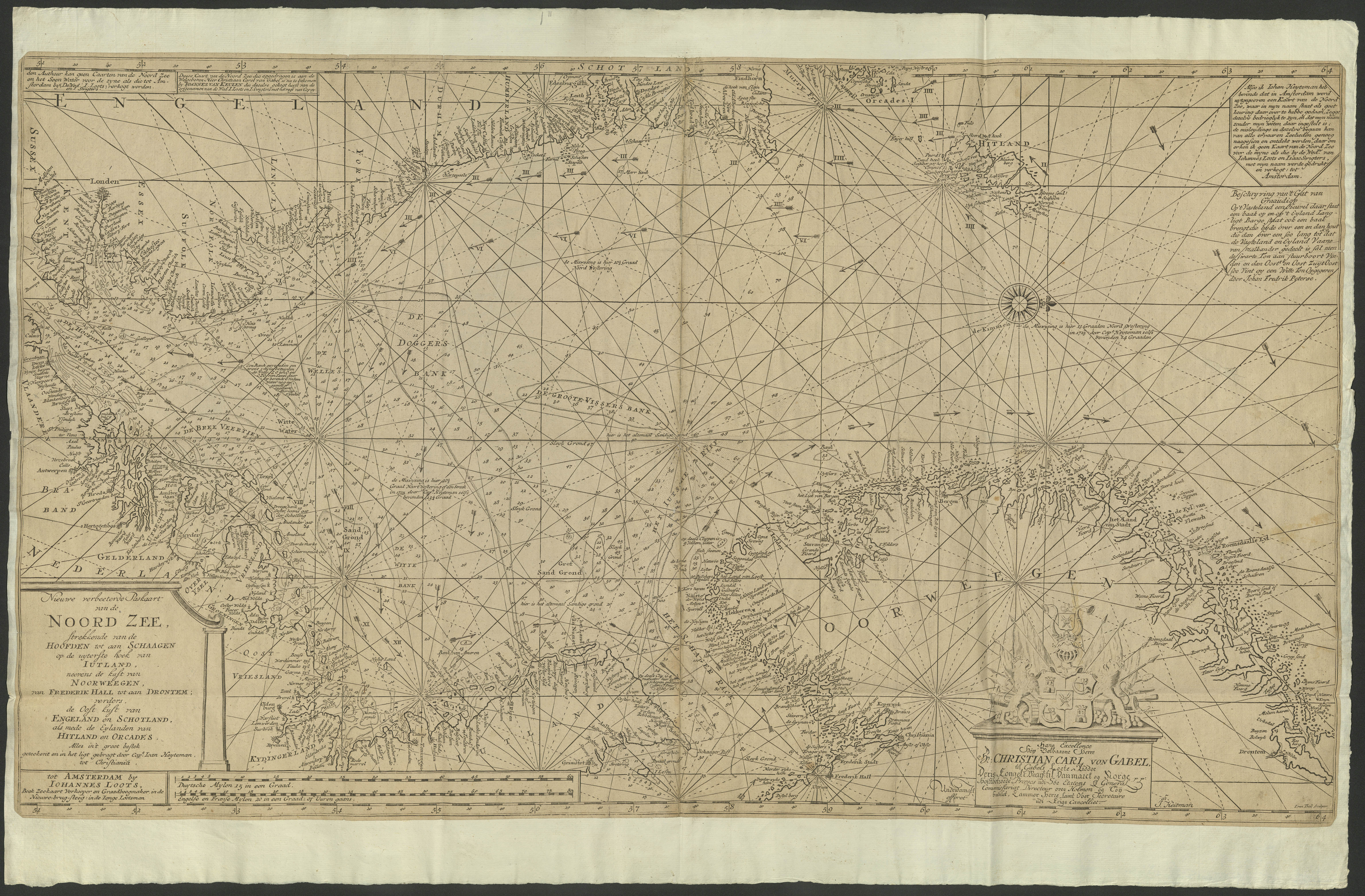 Niewe verbeeterde paskaart van de Noord Zee, strekkende van de hoofden tot aan Schaagen op de uyterste hoek van Iutland, neevens de Kust van Noorweegen, van Frederik Hall tot anna Drontem; verders de Oost Kust van Engeland en Schotland, als mede de Eylanden van Hitland en orcades.[Kartografiskt material]