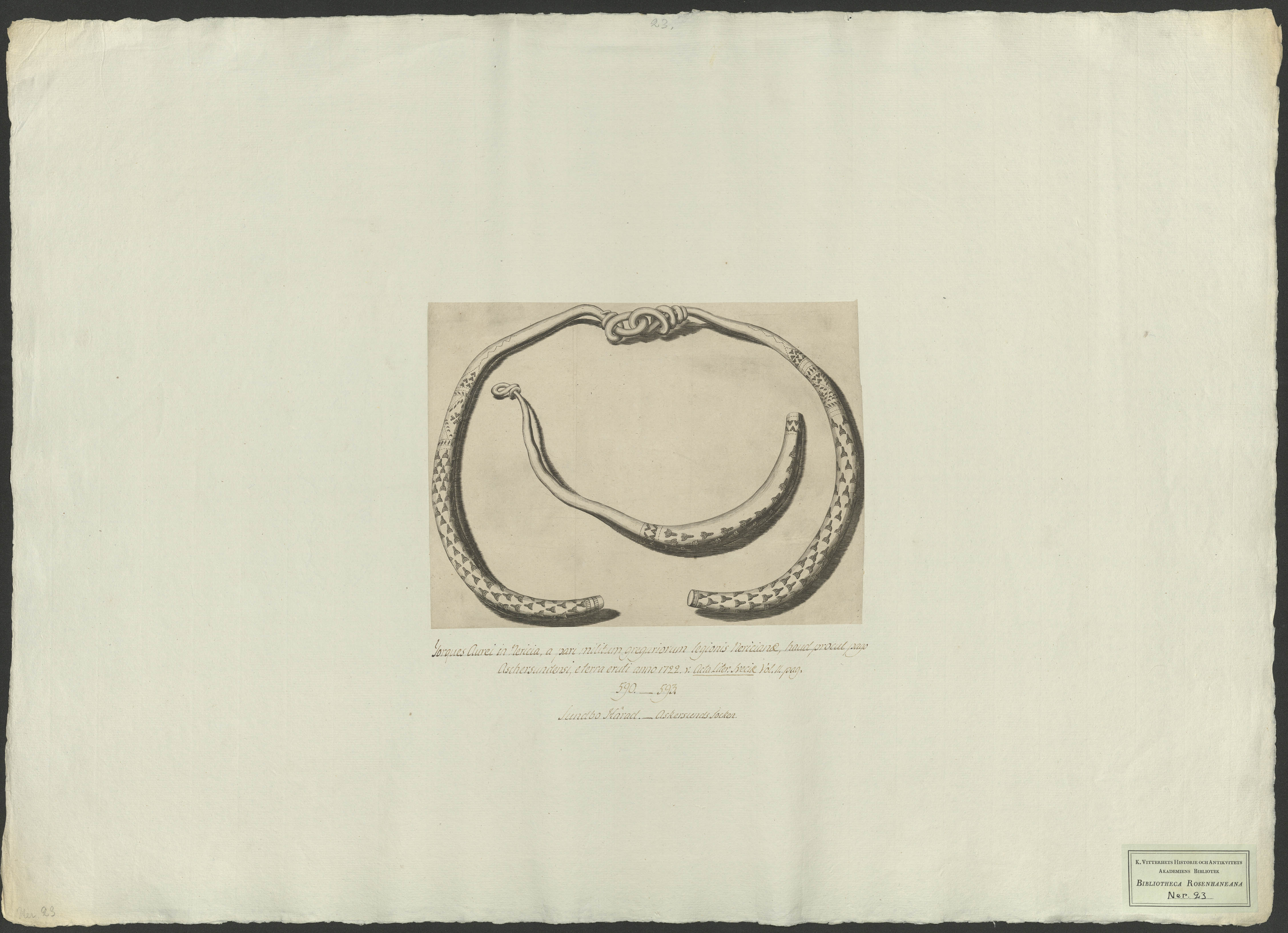 Beskrivning: 1 grafiskt bl. : Teckning av guldhalsringar funna utanför Askersund 1722. Se även artikel i Fornvännen 1989 där samma illustration finns.