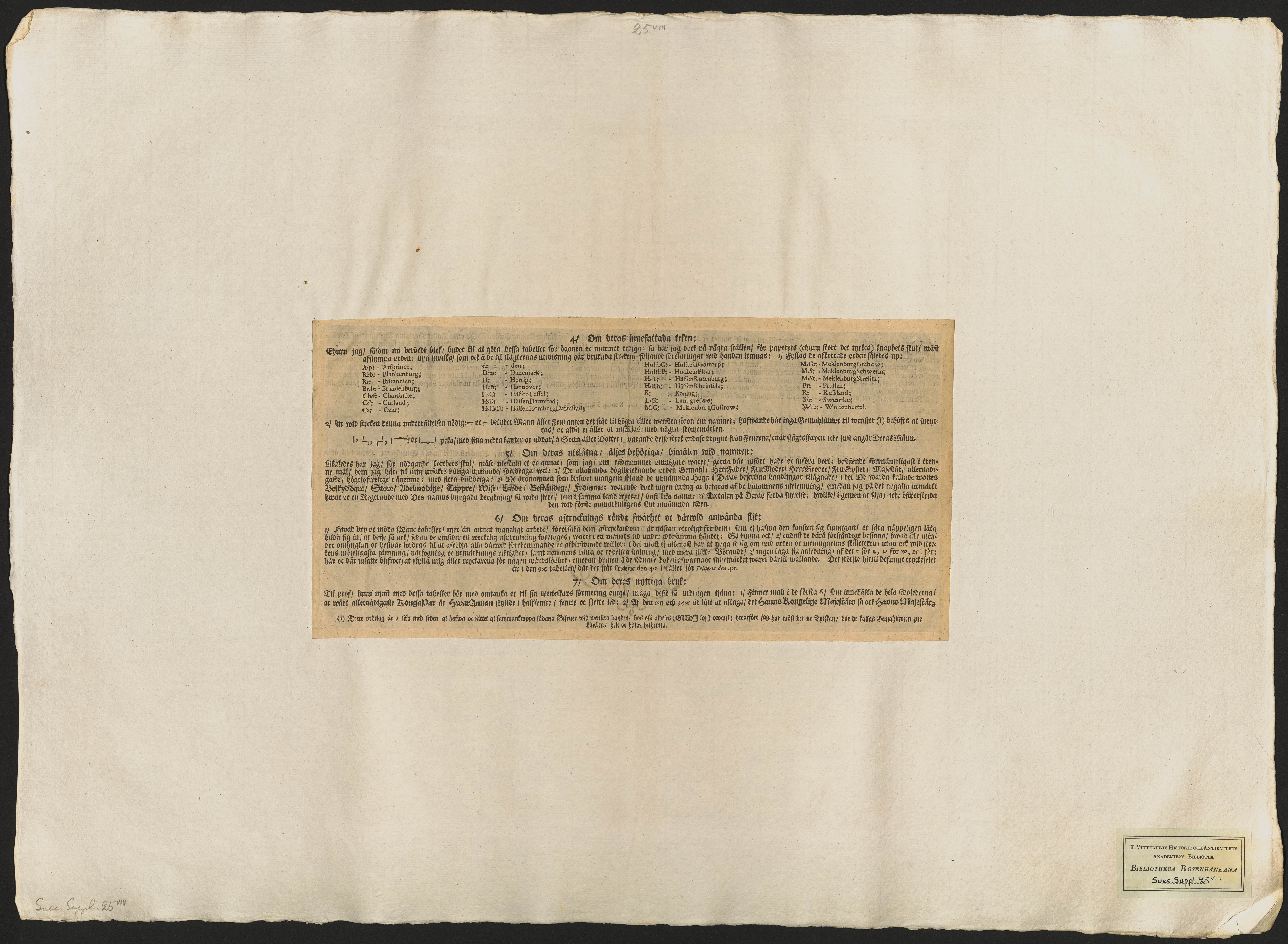 Beskrivning: 2 grafiska bl. : Dubbelsidig i passepartout. Baksidan som är onumrerad utgör sista sidan i verket.