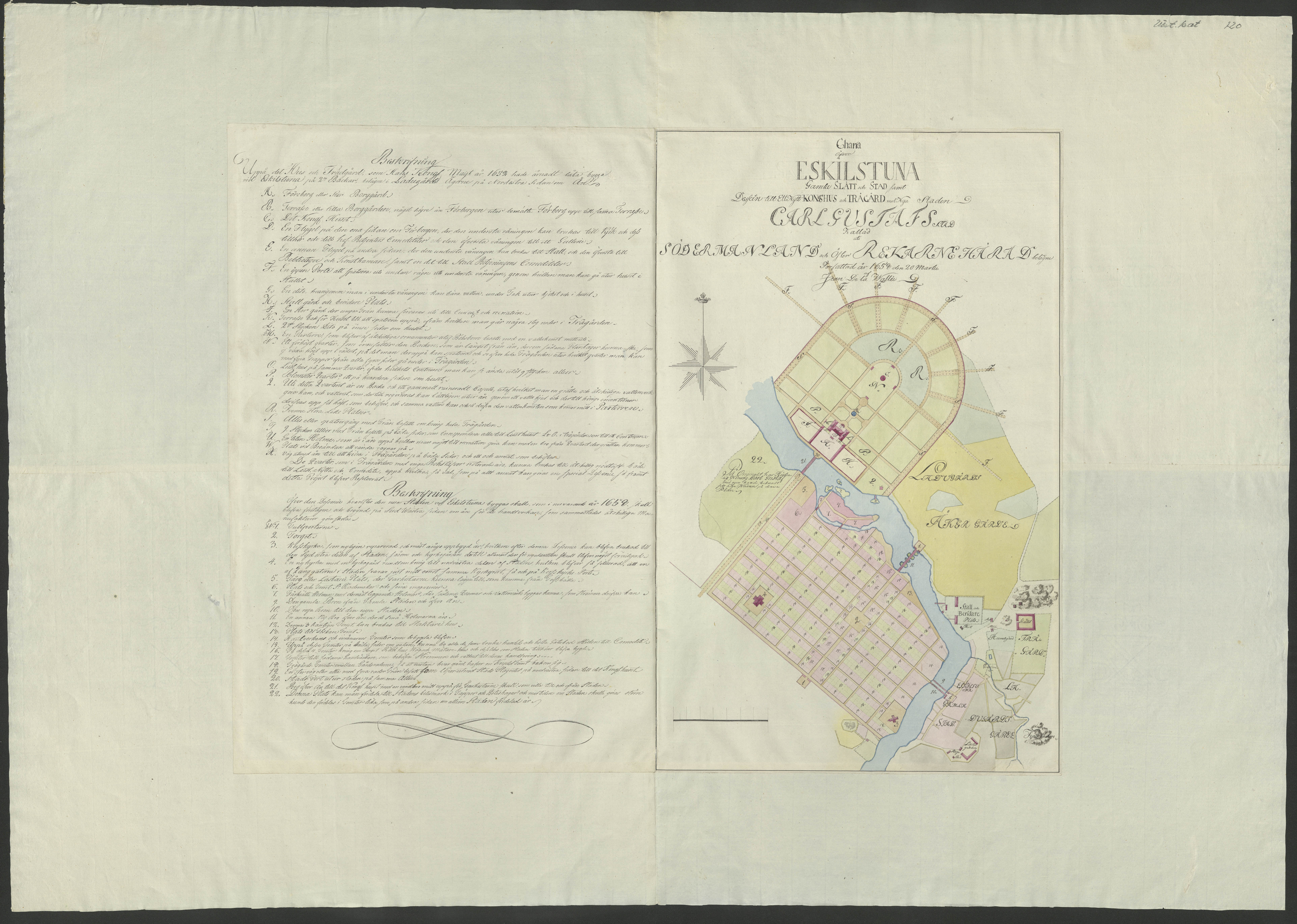 Beskrivning: 1 handritad karta : Ett uppslag med stadsplan över Eskilstuna till höger. Till vänster teckenförklaring. Originalet av Jean de la Vallé. Kopierad av Carl Ulfsparre 1809. författad år 1658 den 20 mars Jean de la Vallé