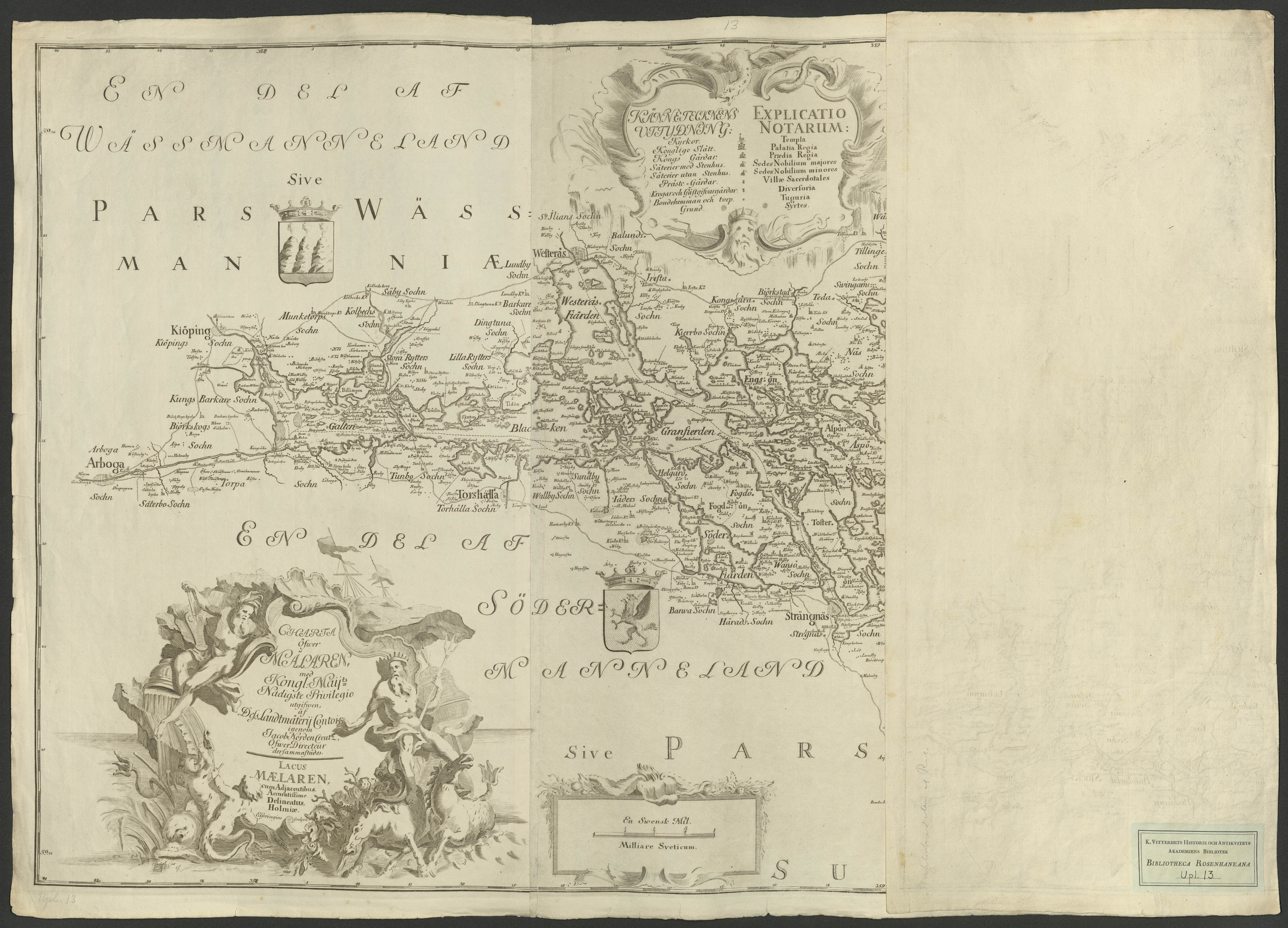 Beskrivning: 1 karta : Mälaren med omgivande socknar. Visar orter och viktigare bebyggelse. E. Geringius Sculpsit.