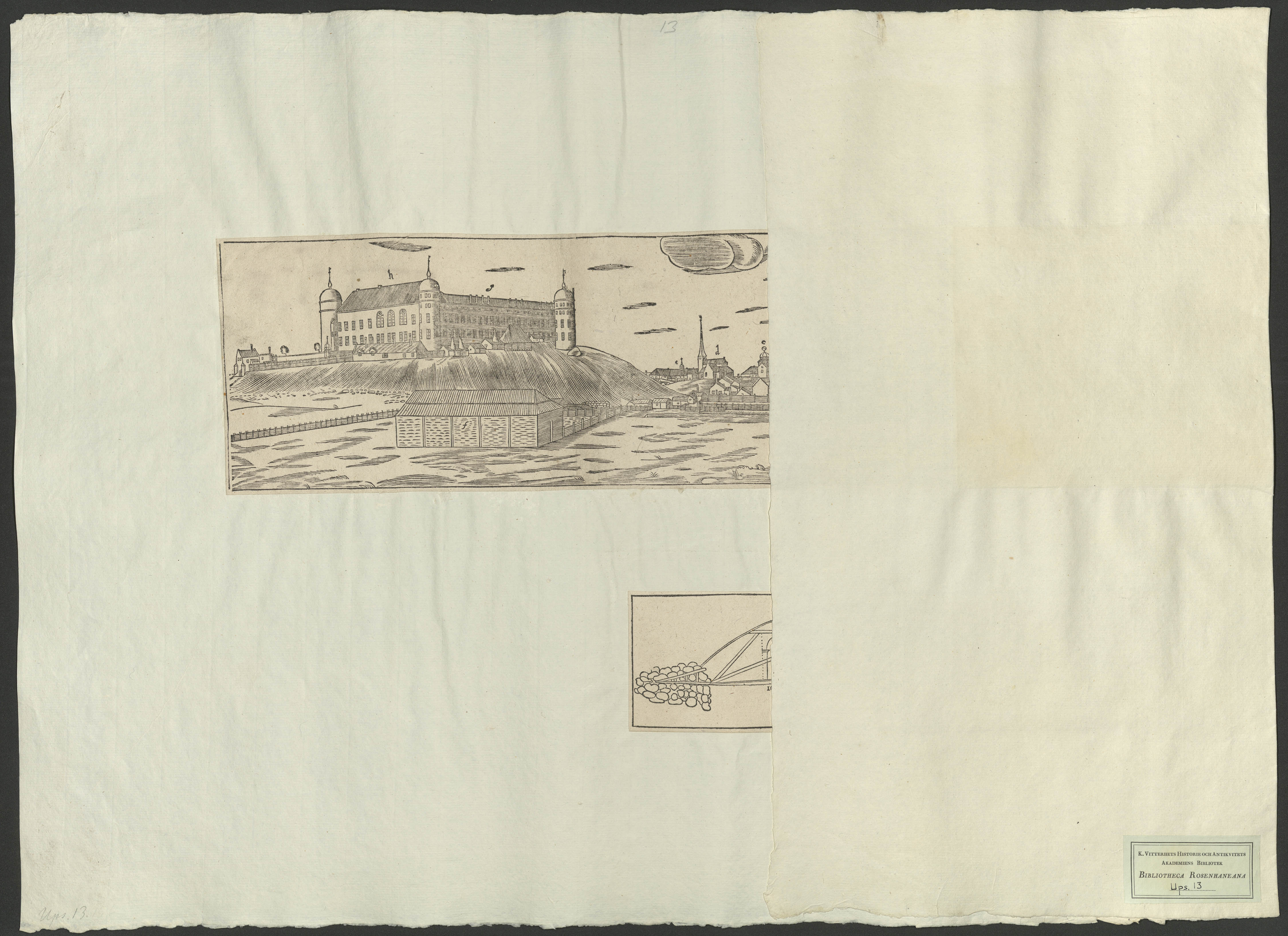 Beskrivning: 2 grafiska bl. : Panoramabild över slottet och staden samt en ritning med en tvärsektion av en bro.