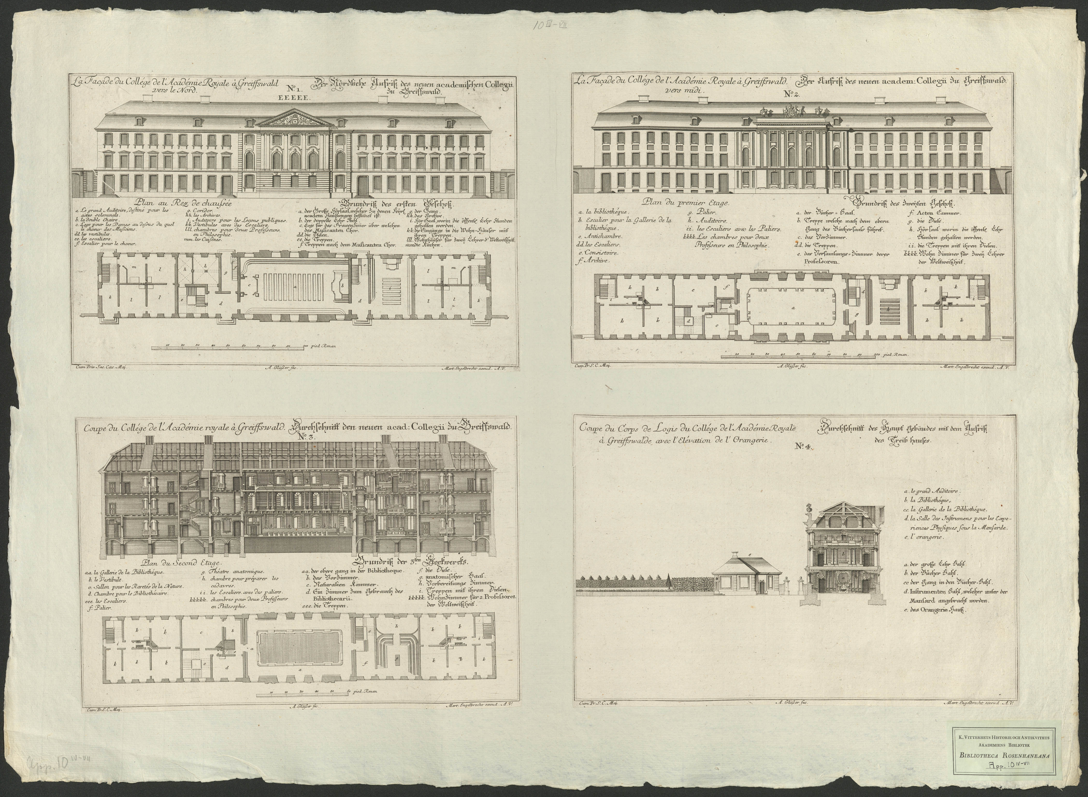 [Fasad- och planritningar samt tvärsnitt av Kungliga Akademien i Greiffswald].[Bild]
