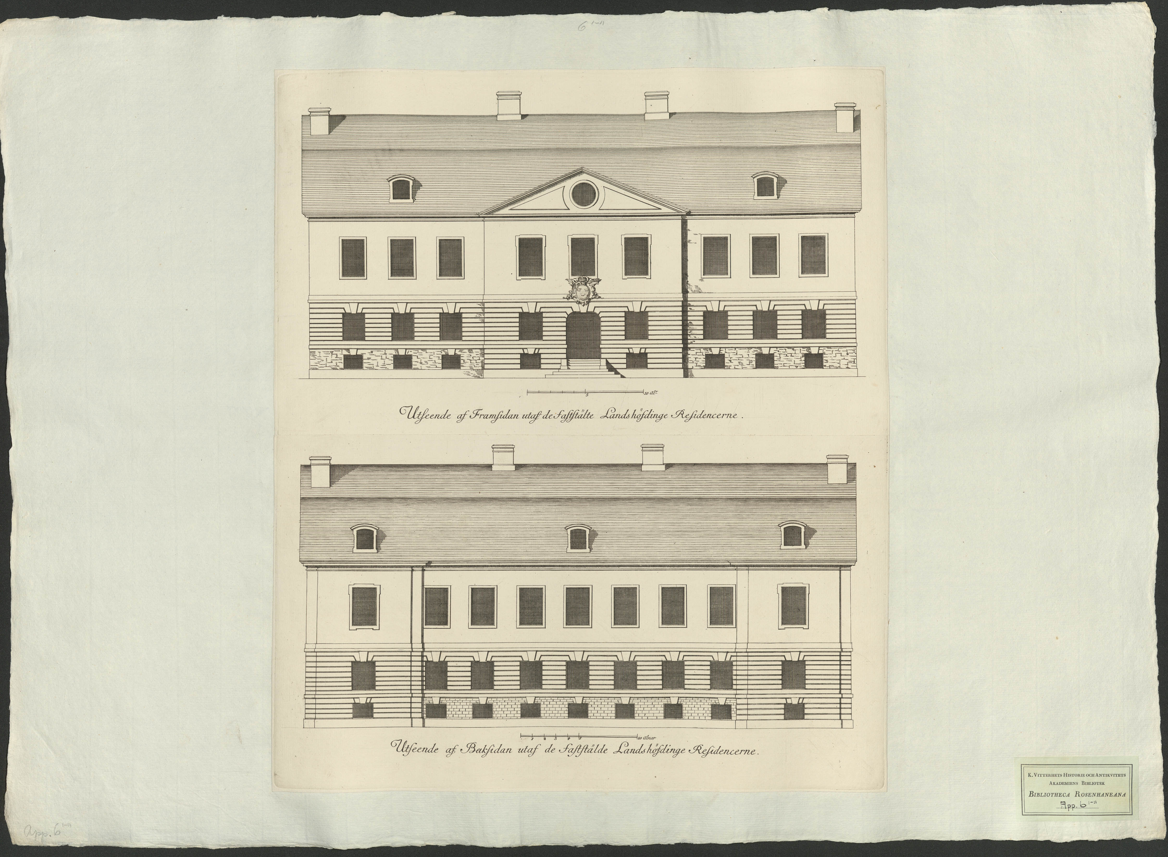 Beskrivning: 2 grafiska bl. : klistrade sida vid sida Hårlemans mönsterritningar till landshövdingeresidens fastställda av Konungen 1746. Fasadritningar till stenhus. Skala ca 1:80.