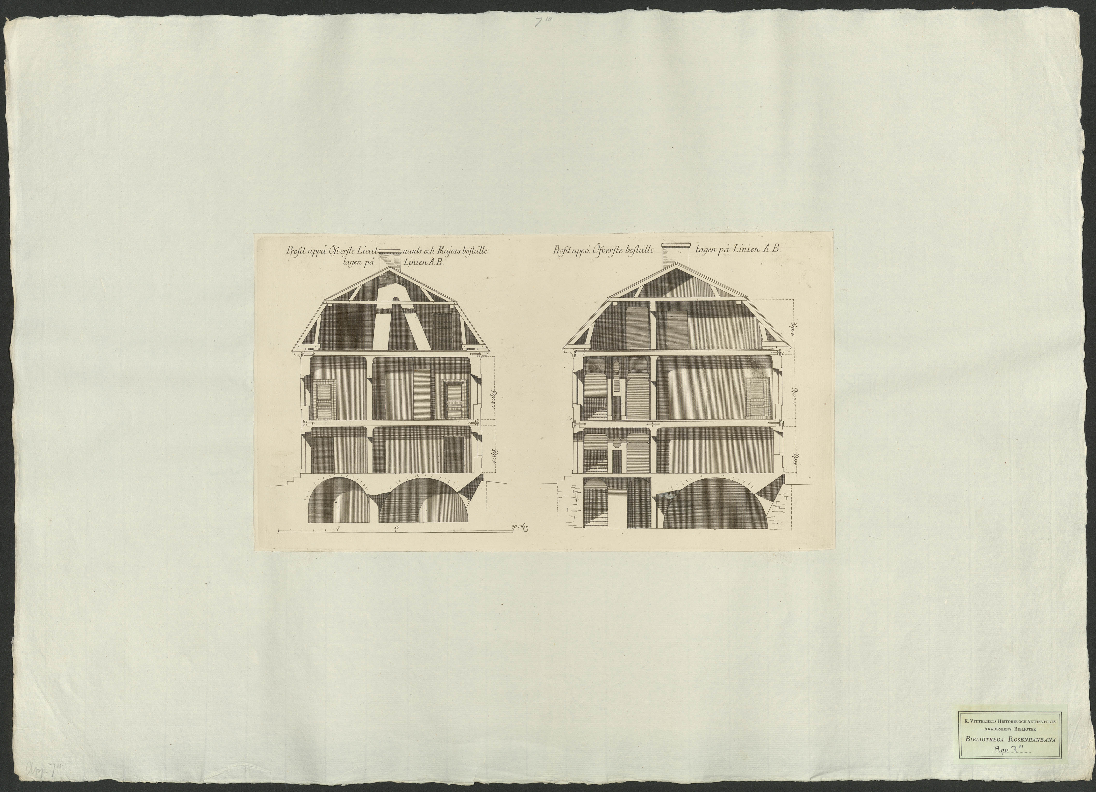 Beskrivning: 1 grafiskt bl. : Hårlemans mönsterritningar till överstelöjtnants- och majorsboställe fastställda av Konungen 1746. Fasad- och planritningar. Skala ca 1:70.