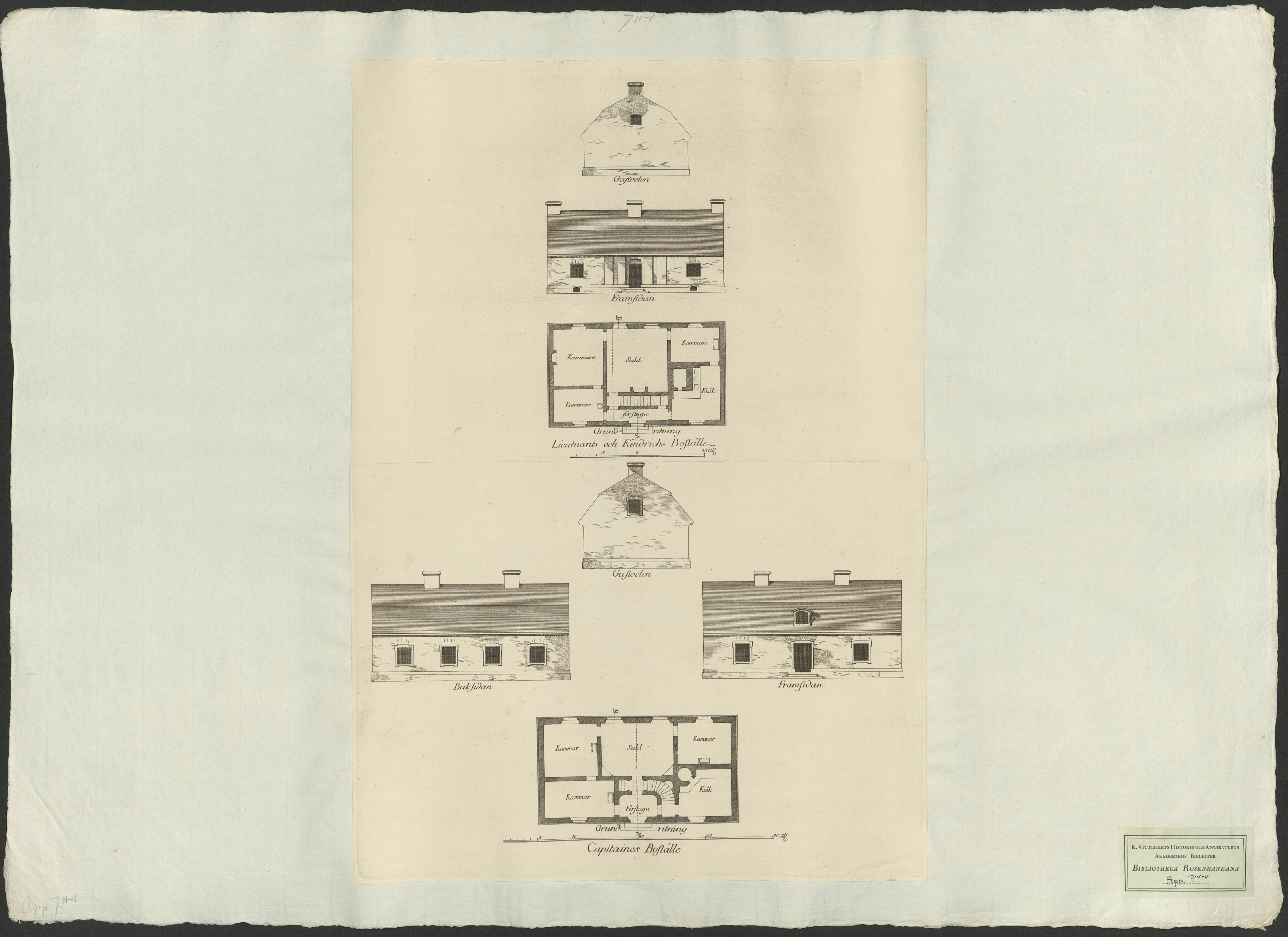 Beskrivning: 2 grafiska bl. : hopklistrade Hårlemans mönsterritningar till löjtnants- och fänriksboställe fastställda av Konungen 1746. Fasad- och planritningar. Skala ca 1:150.