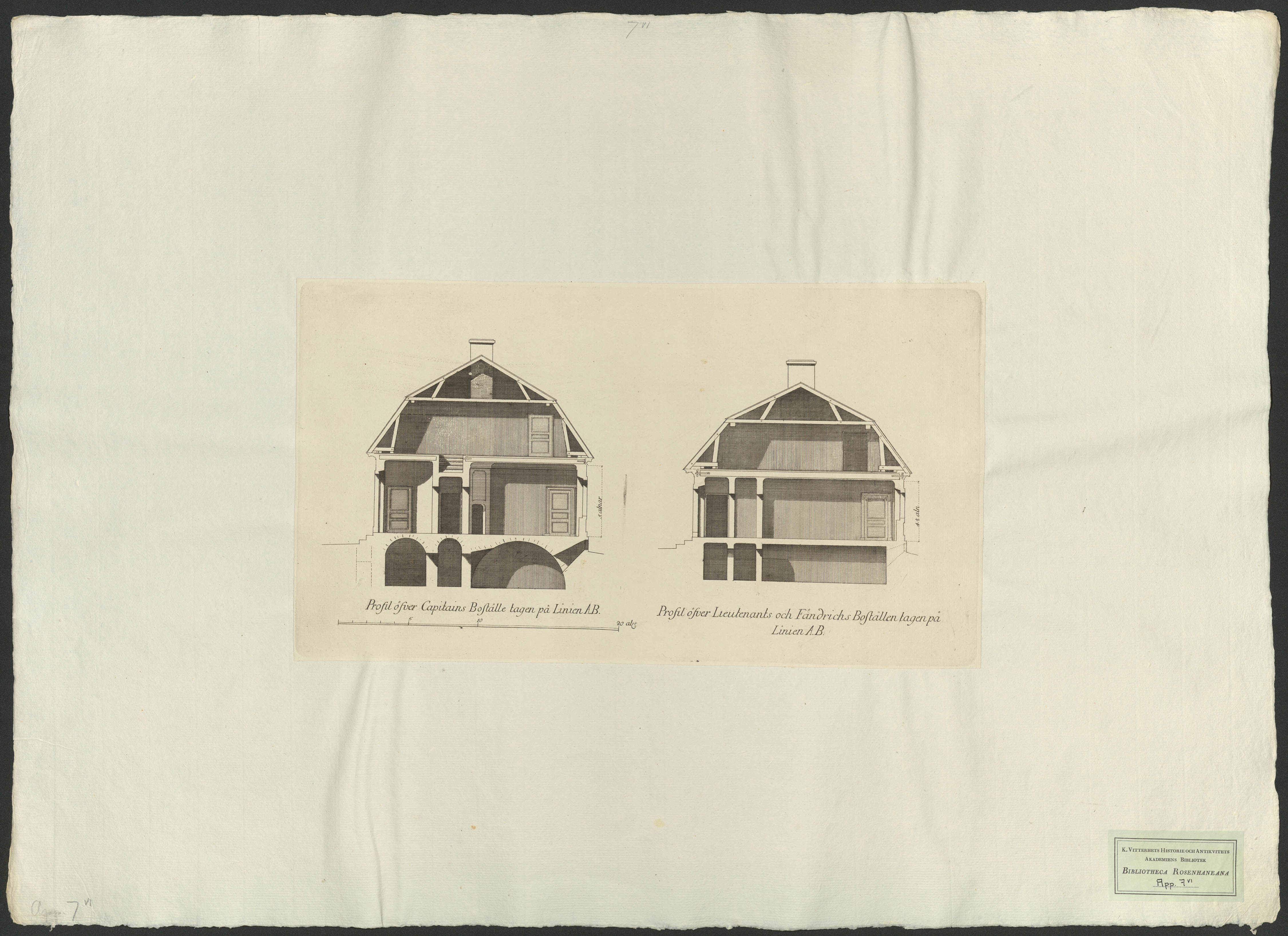 Beskrivning: 1 grafiskt bl. : Hårlemans mönsterritningar till kaptens- och löjtnantsboställe fastställda av Konungen 1746. Tvärsnitt. Skala ca 1:70.