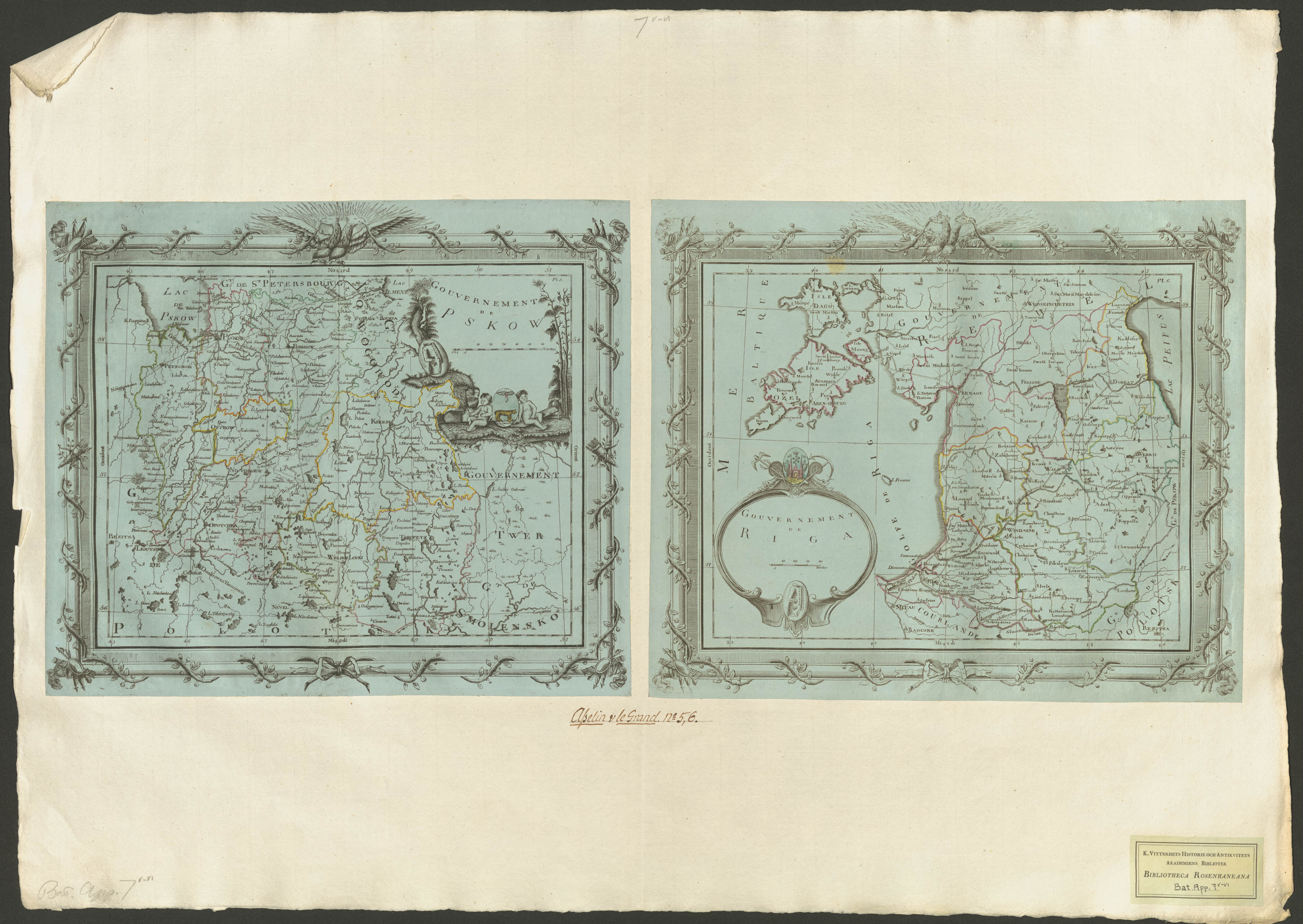 Beskrivning: 1 karta : Topografisk karta på blått papper. Positionsangivelser i lat-long. Skalstreck i verst.;Pskow län. Administrativa gränser kolorerade.
