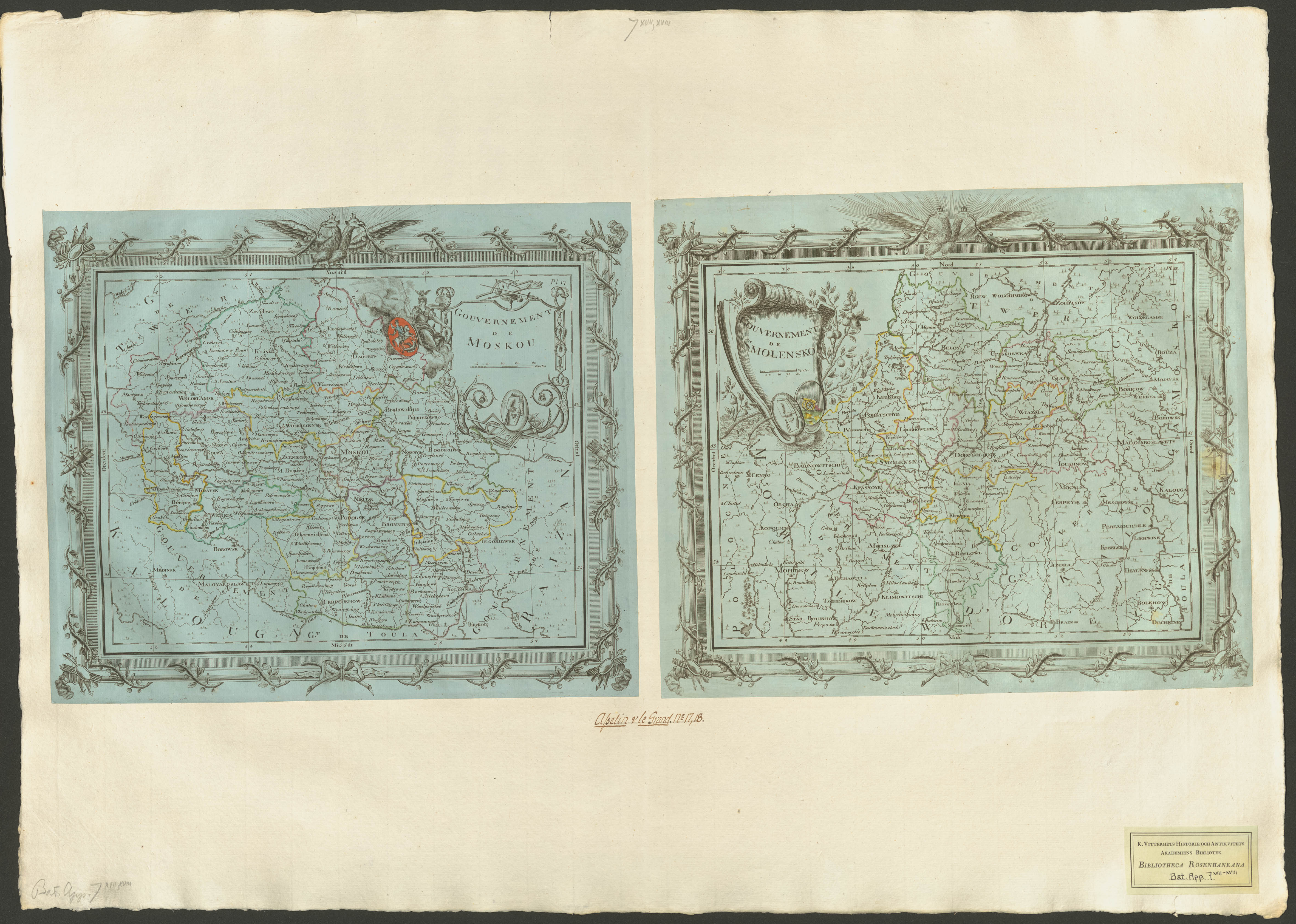 Beskrivning: 1 karta : Topografisk karta på blått papper. Positionsangivelser i lat-long. Skala 1 cm = ca 11 verst.;Moskva län. Administrativa gränser kolorerade.