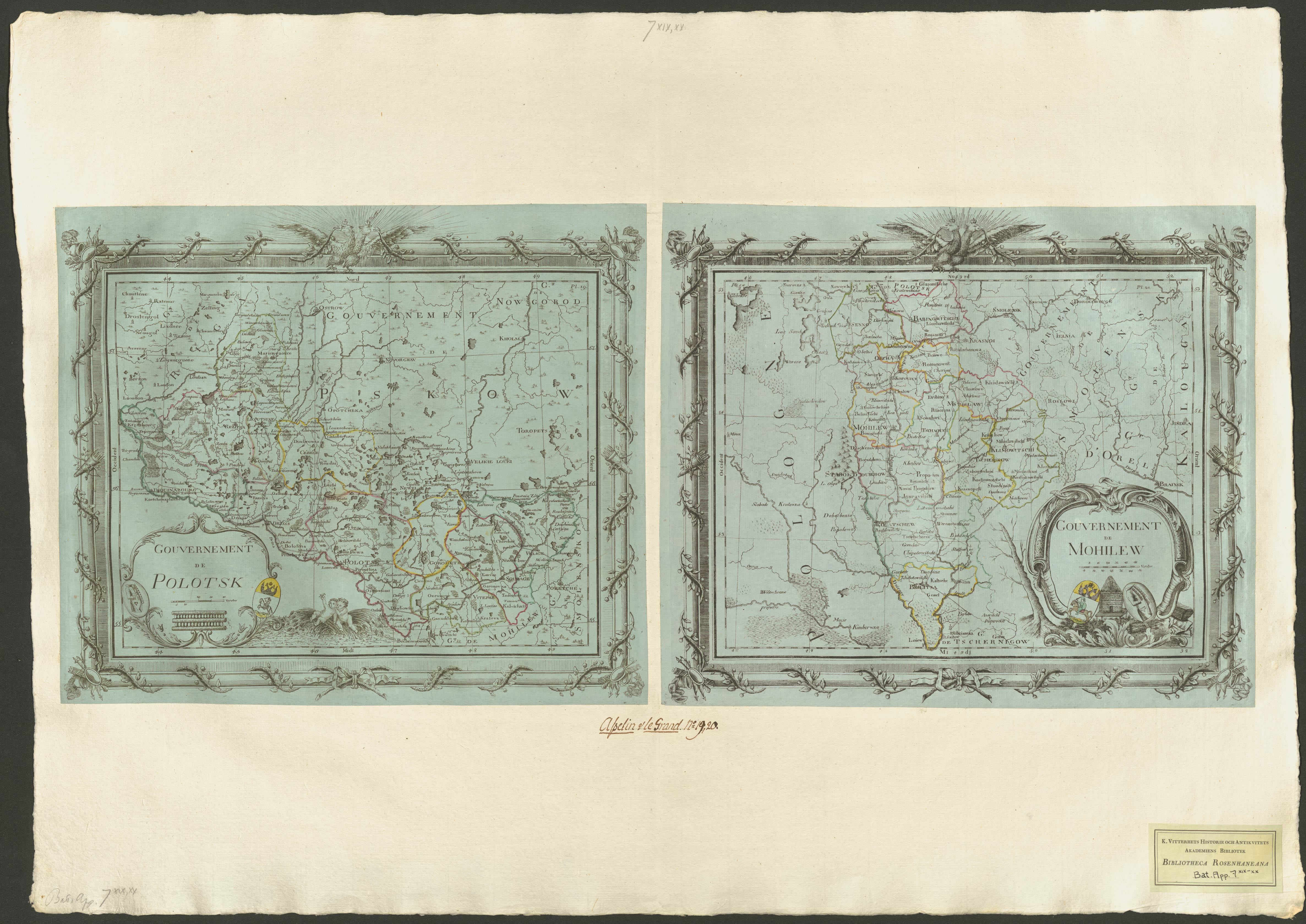 Beskrivning: 1 karta : Topografisk karta på blått papper. Positionsangivelser i lat-long. Skala 1 cm = ca 12,5 verst.;Polotsk län. Administrativa gränser kolorerade.