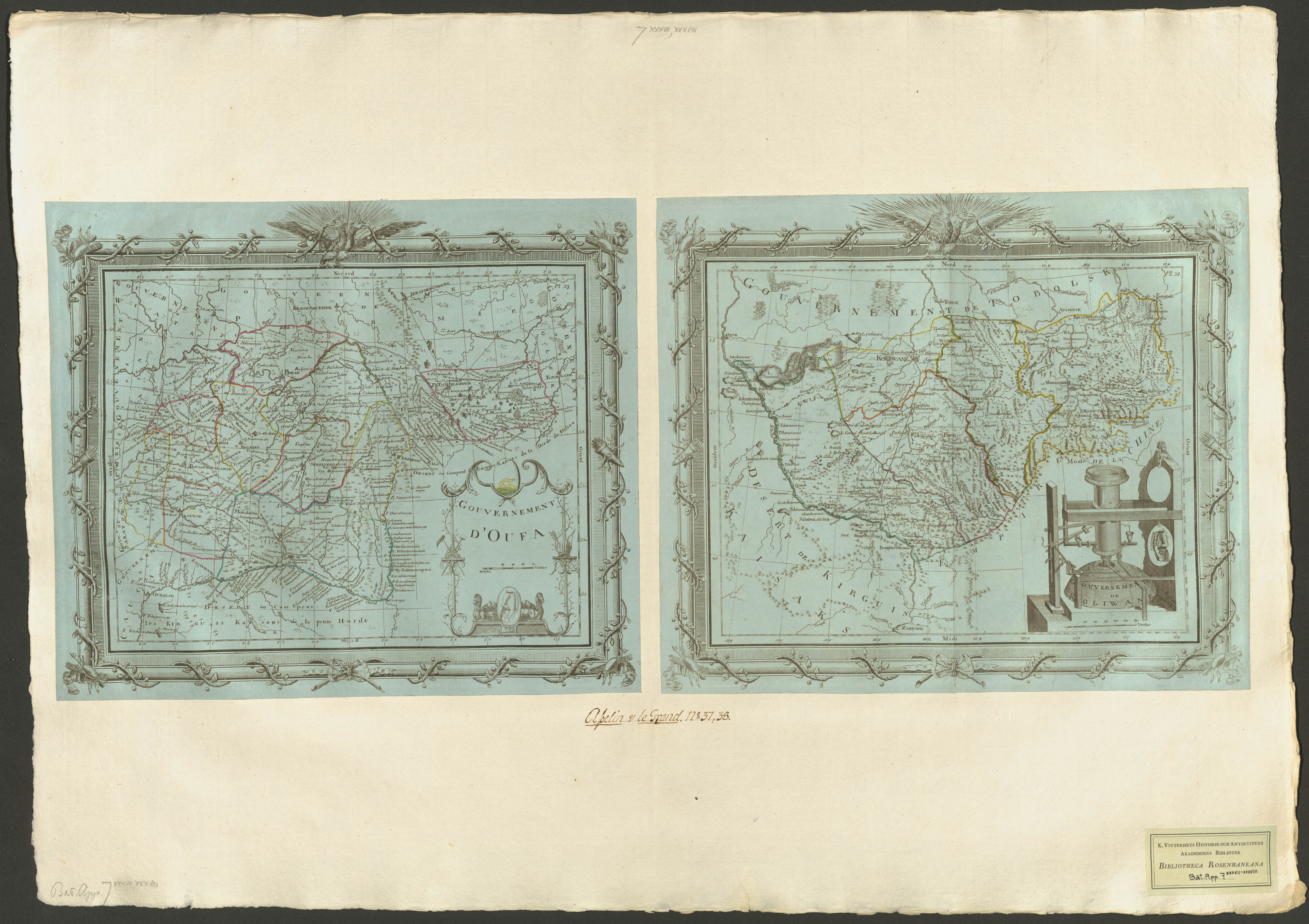 Beskrivning: 1 karta : Topografisk karta på blått papper. Positionsangivelser i lat-long. Skala 1 cm = ca 31 verst.;Oufa län. Administrativa gränser kolorerade.