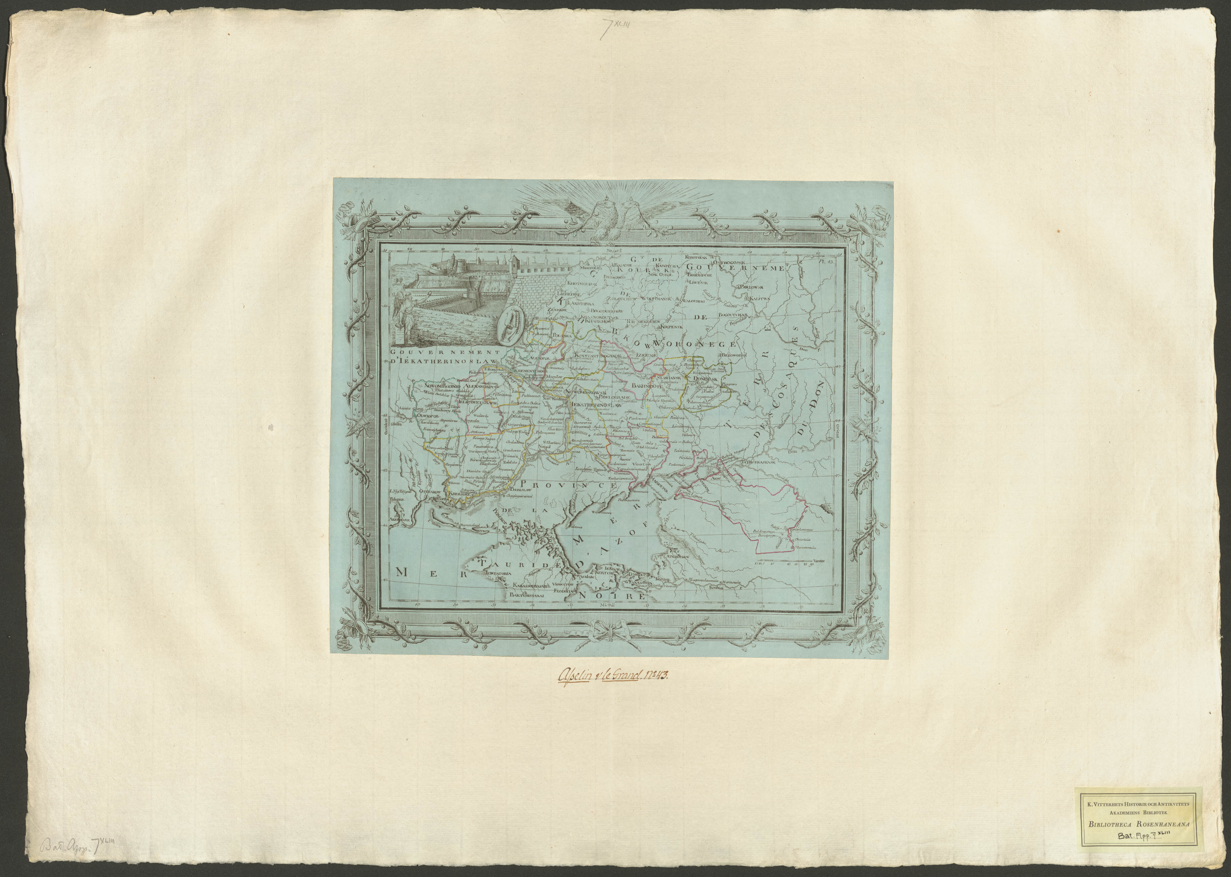Beskrivning: 1 karta : Topografisk karta på blått papper. Positionsangivelser i lat-long. Skala 1 cm = ca 30 verst.;Iékatherinoslaw län . Administrativa gränser kolorerade.