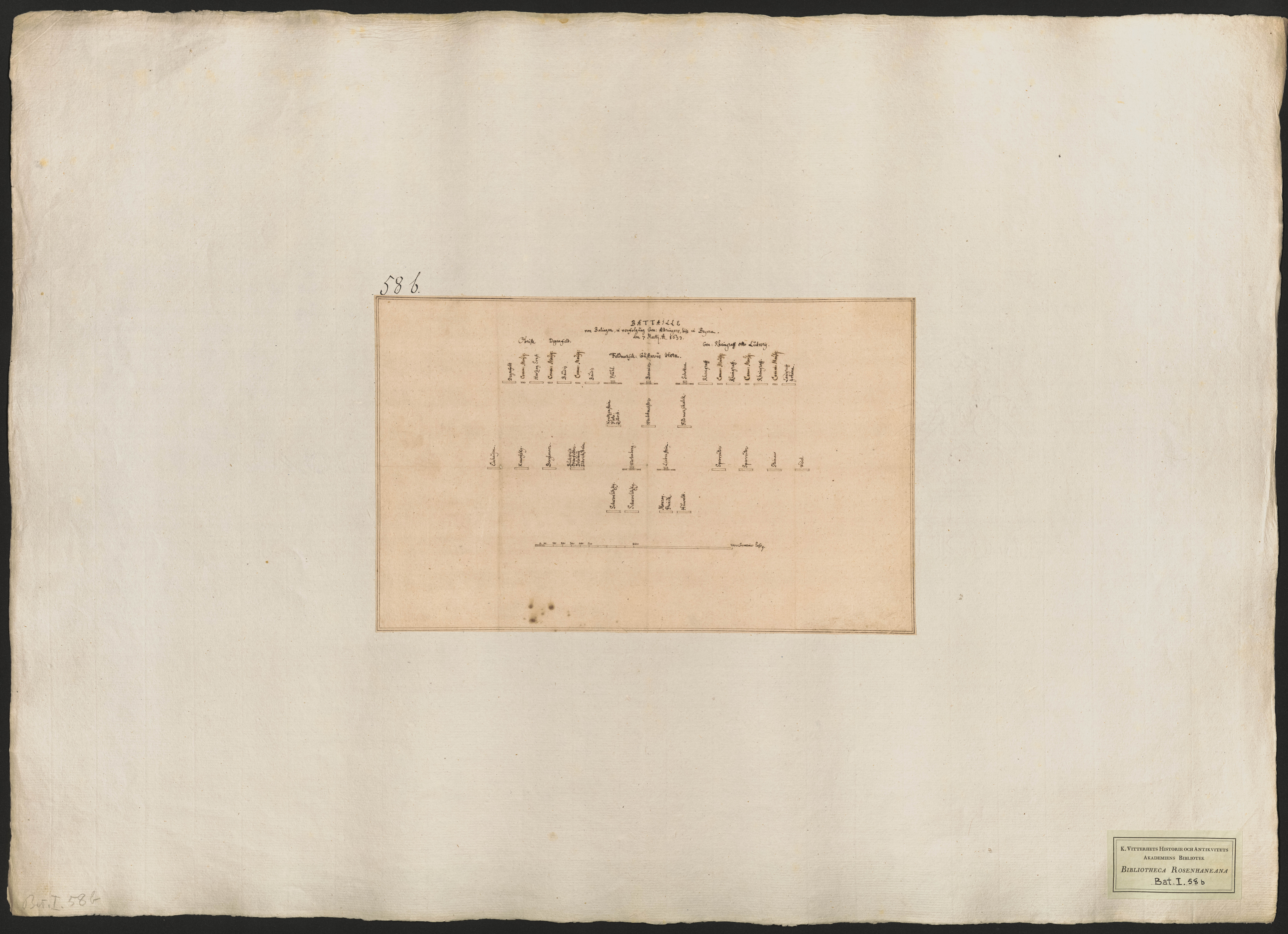 Beskrivning: 1 handritad teckning. : Schematisk skiss över truppuppställningarna vid slaget vid Balingen den 7 mars 1633. Skalstreck.