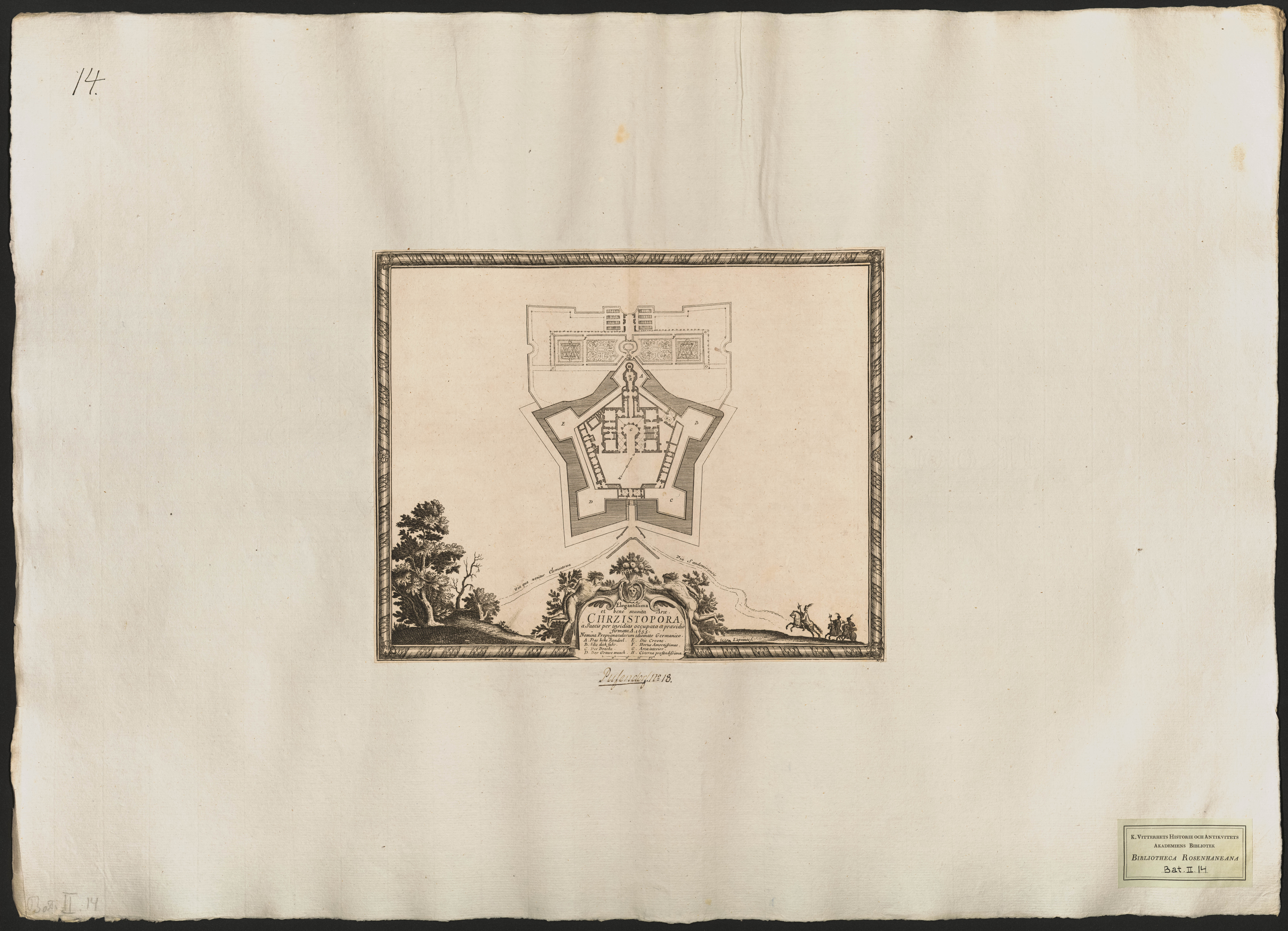 Beskrivning: 1 grafiskt bl. : Plan över stjärnformad fästning. I förgrunden ett landskap med ryttare i snedperspektiv. Lapointe f.