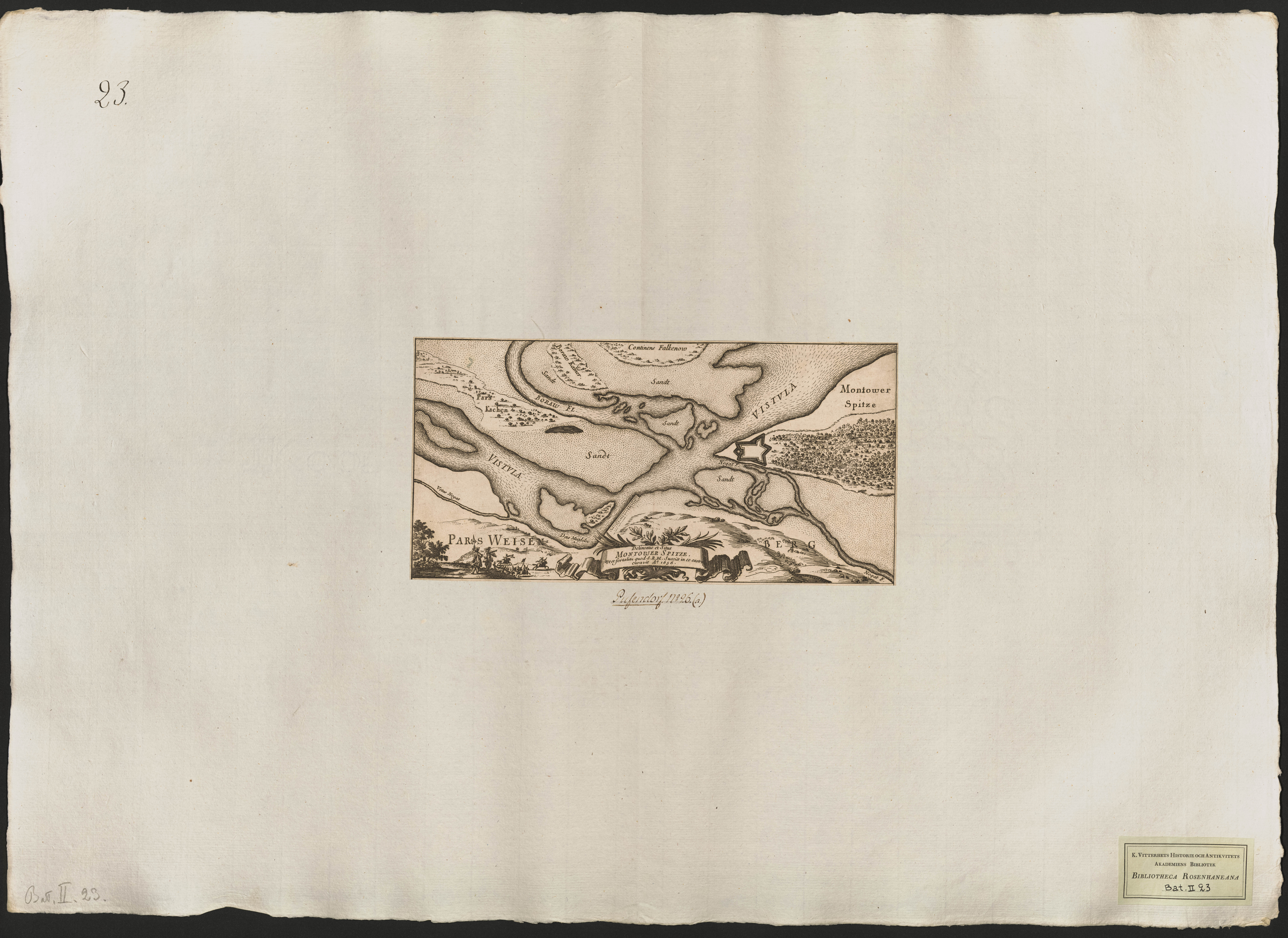 Beskrivning: 1 karta : Kartliknande teckning över fästningen vid Montower Spitze och floden Vistula med sandbankar. I förgrunden liten landskapsvy med en trupp soldater.