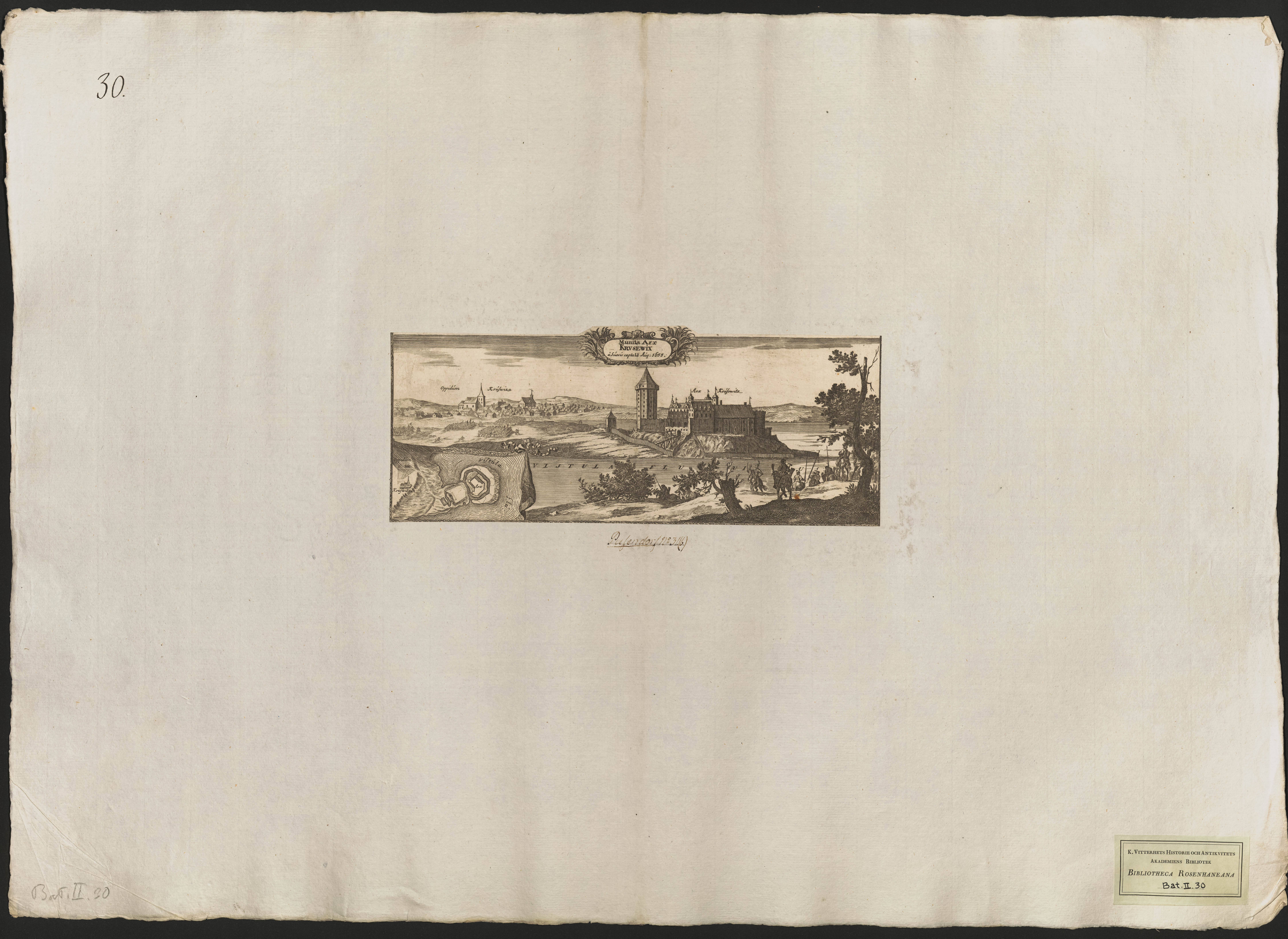 Beskrivning: 1 grafiskt bl. : Vy över staden Krusewix (Kruszwica) vid Wisla. I förgrunden svenska soldater. I vänster nederkant en stadsplan.