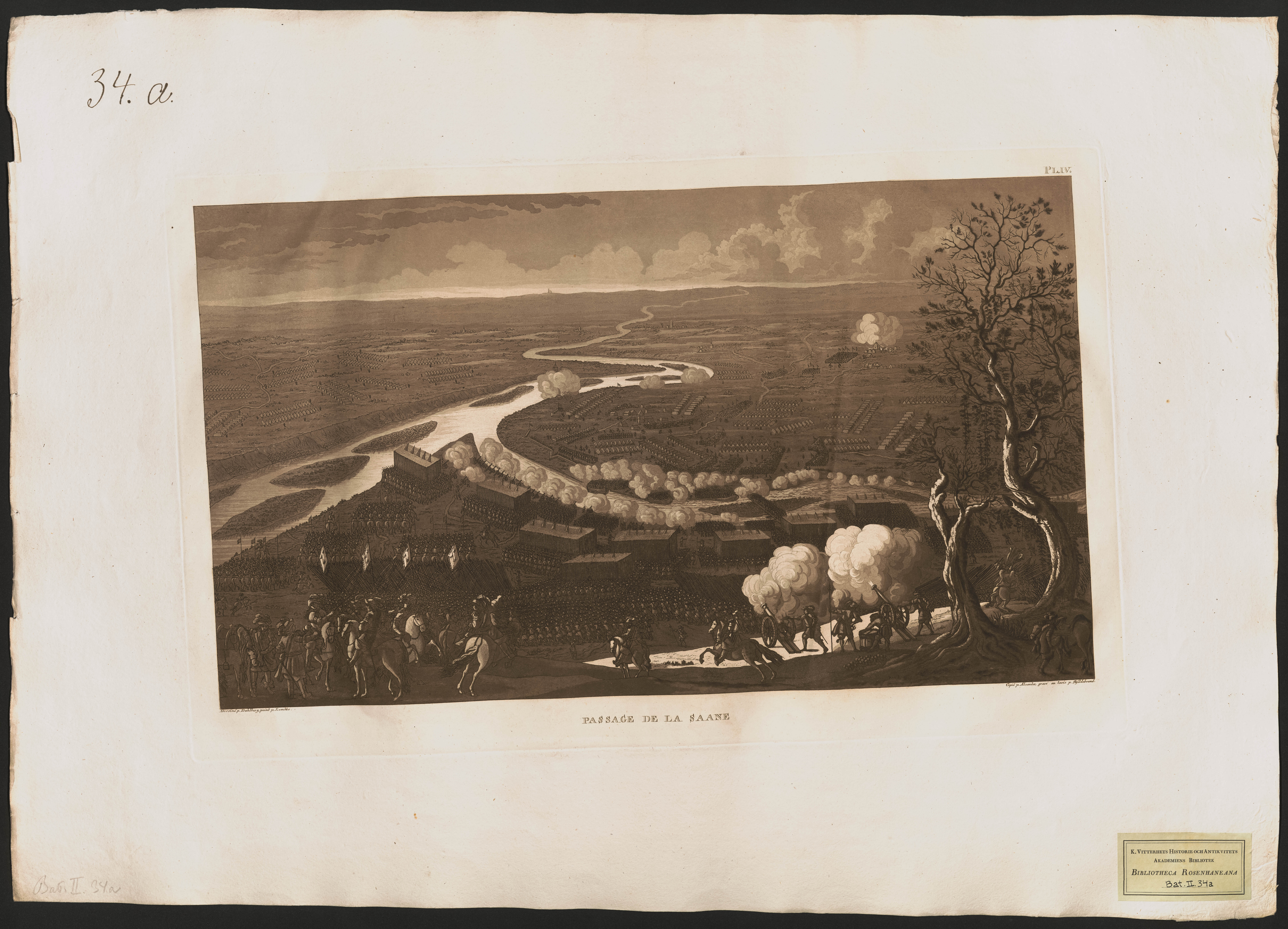 Beskrivning: 1 grafiskt bl. : Panorama över en vid dalgång och den svenska härens passage över floden. dessiné p. Dahlberg, peint p Lembke. Copié p Aleander, gravé au lavis p Skjöldebrand.