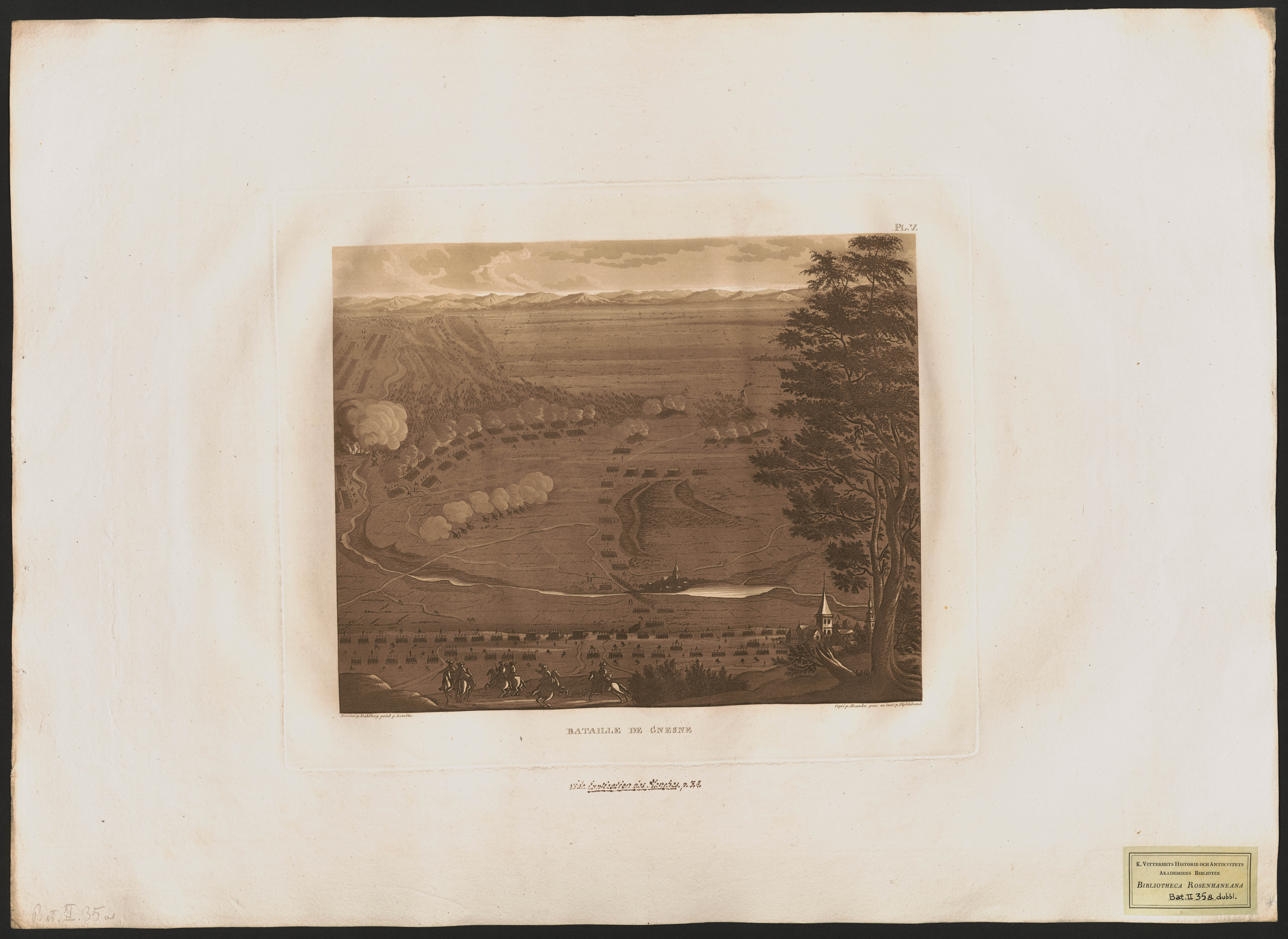 Beskrivning: 1 grafiskt bl. : Vy över slaget vid Gnesen. Dessiné p. Dahlberg, peint p Lembke. ; Copié p Aleander, gravé au lavis p Skjöldebrand.