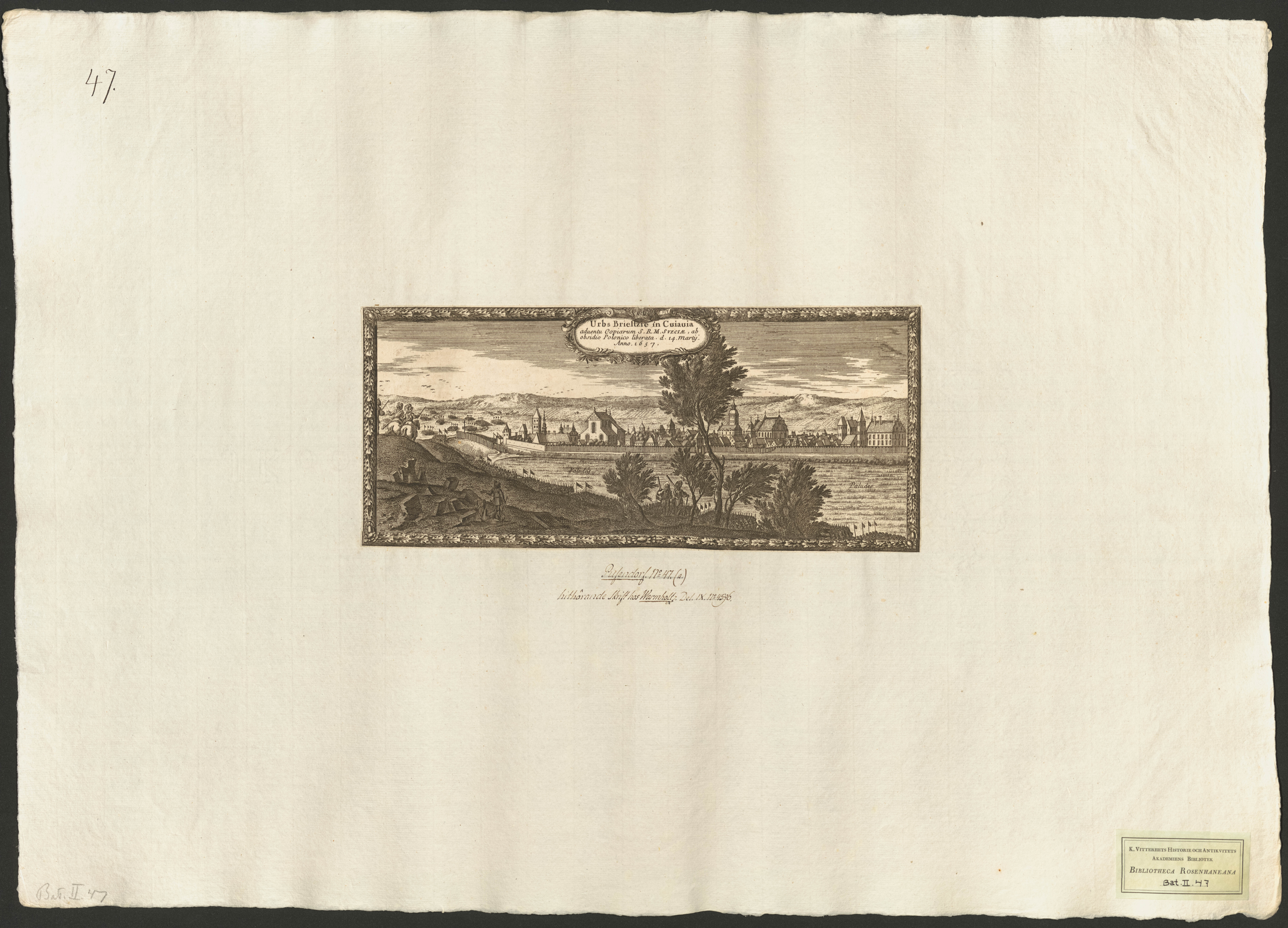 Beskrivning: 1 grafiskt bl. : Vy över staden Briestzie. I förgrunden några svenska soldater som blickar ut över staden. I bakgrunden till vänster truppuppställningar.