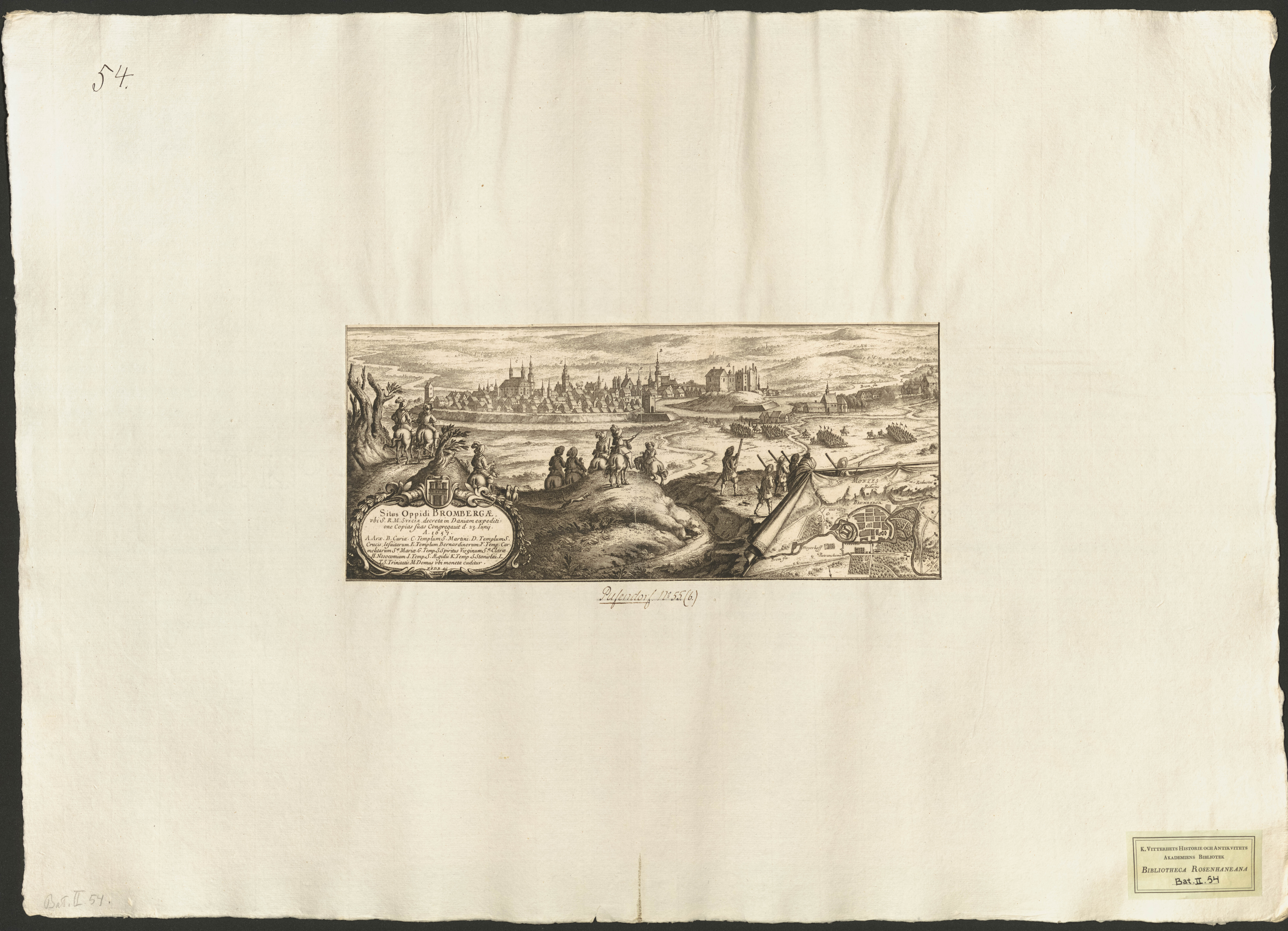Beskrivning: 1 grafiskt bl. : Vy över Bromberg. Svenska armén står utanför murarna. I förgrunden ryttare och fotfolk. Nedan till höger en utspänd planritning över stadens befästningsverk. E.I. D.B. del.