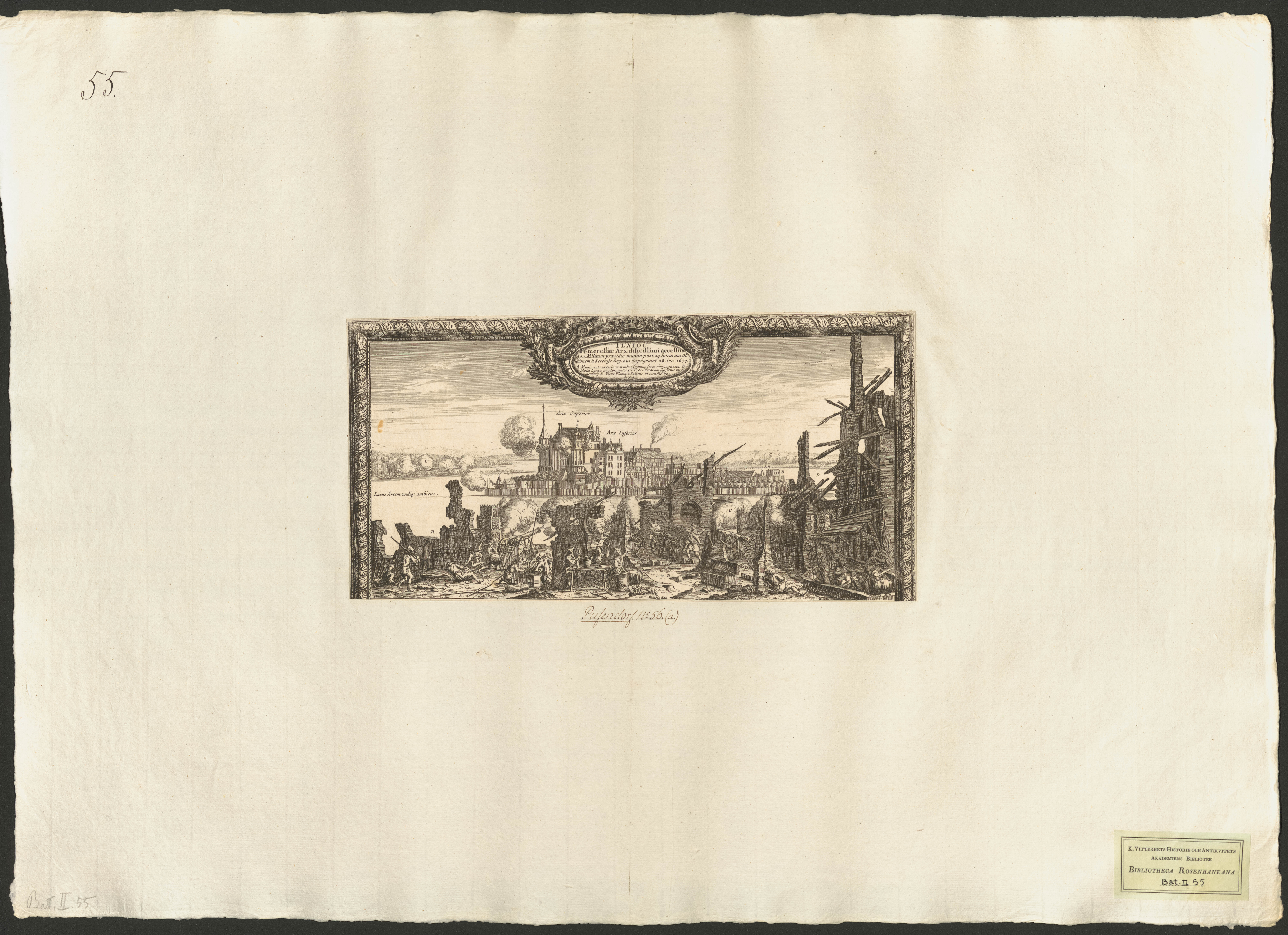 Beskrivning: 1 grafiskt bl. : Svenska hären intar Flatou (Flotow). I förgrunden ett kanonbatteri uppställt i skydd av sönderskjutna hus och ruiner.;Övre delen av kopparsticket. På nedre delen, se Rh Bat II 56, finns signaturen: "N. Perelle Sculp." Dahlberg delin.