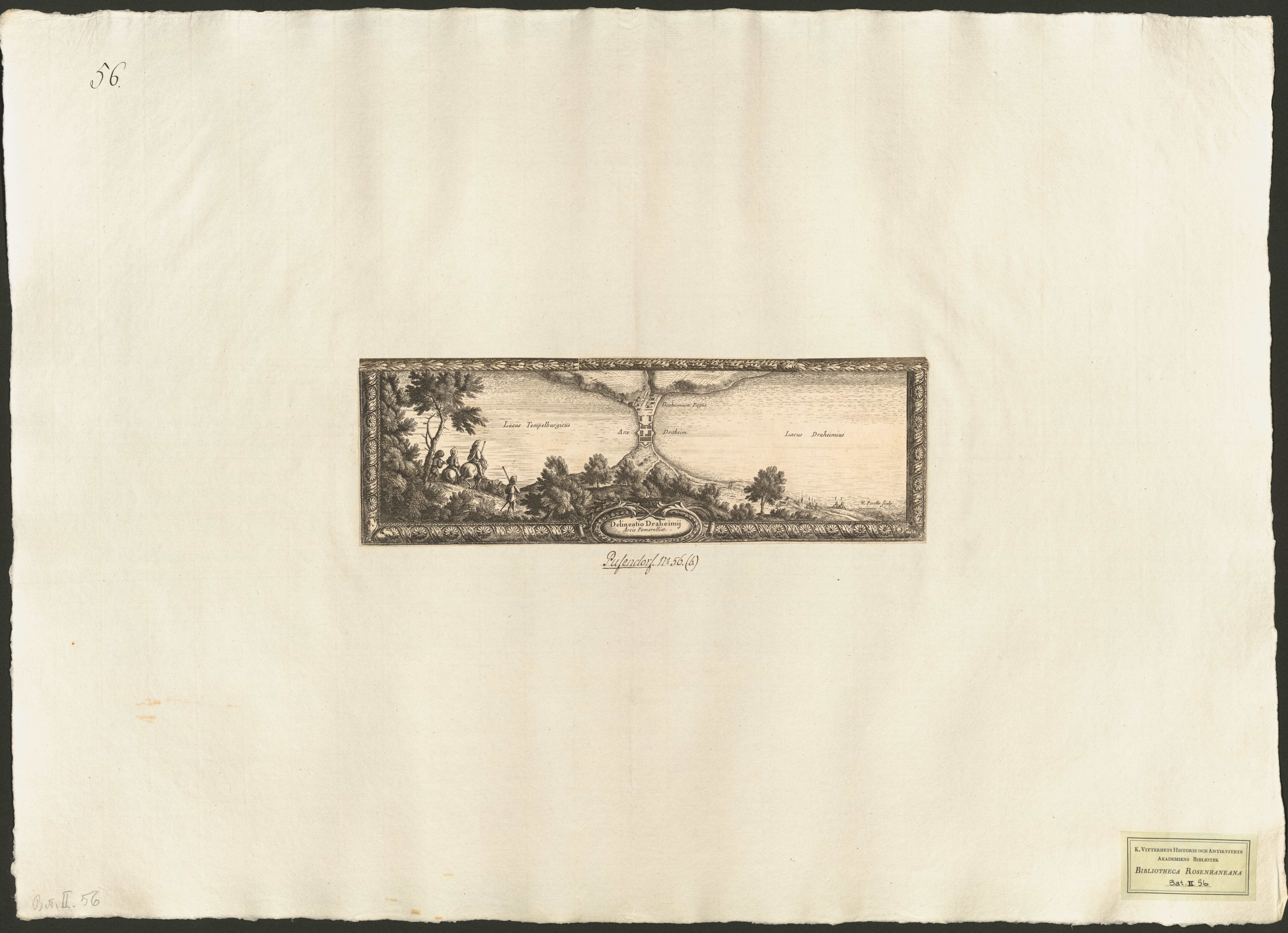 Beskrivning: 1 grafiskt bl. : Vy över Draheimij (Draheim), i Pommerellen, på ett smalt näs mellan två sjöar. I förgrunden en hög strandbrink med några män som tittar ut över landskapet.;Nedre delen av kopparsticket. På den övre delen, se Rh Bat II 55, finns signaturen: "Dahlberg delin." N. Perelle Sculp.