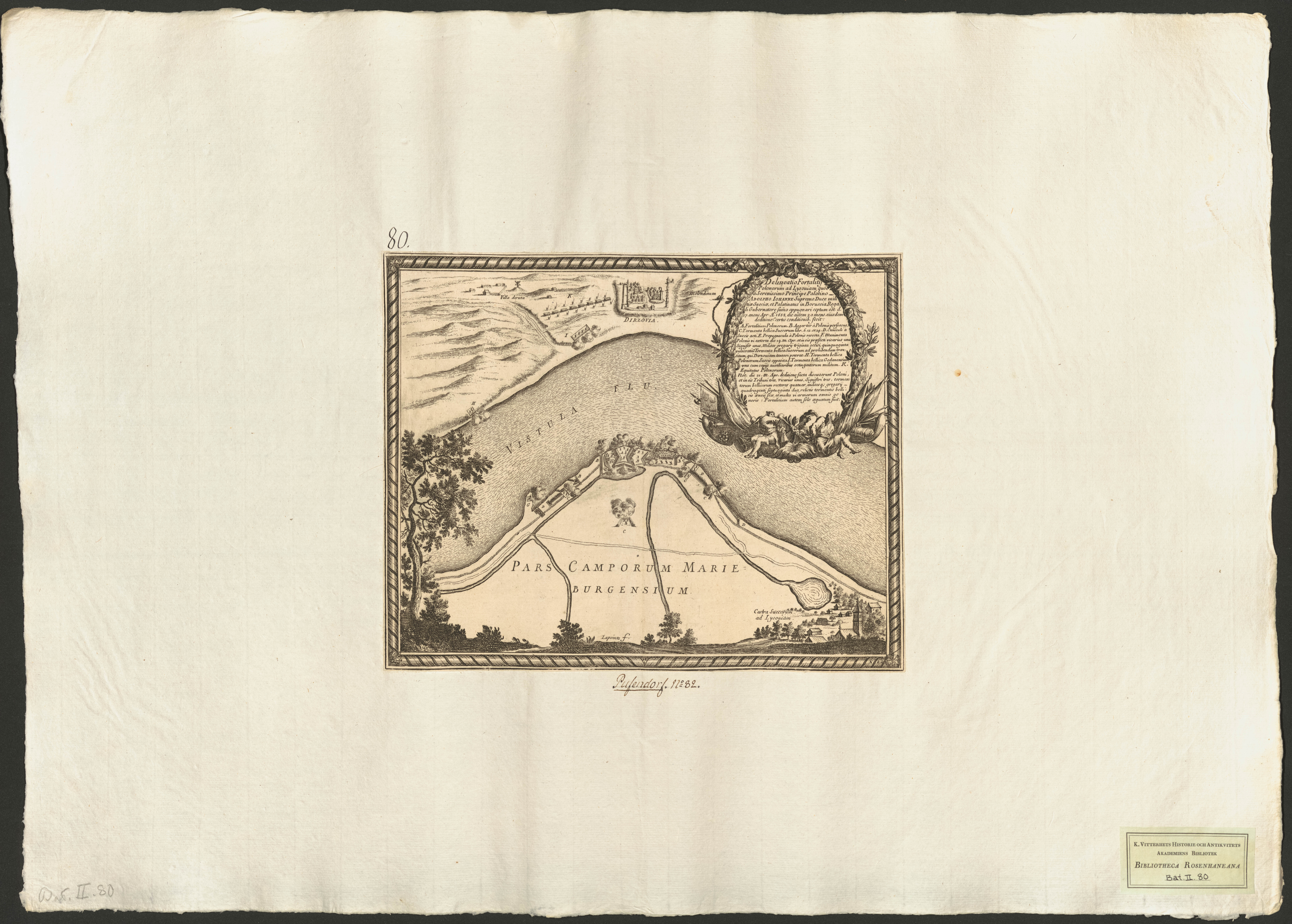 Beskrivning: 1 karta : Topografisk plansch över fästningen Dirzovia vid Wisla, Polen. I förgrunden ett landskap med en by i snedperspektiv. Däröver en kartliknande teckning över floden, fästningen och staden. I terrängen syns svenska arméns posteringar, varifrån fästningen beskjuts. Lapointe f.