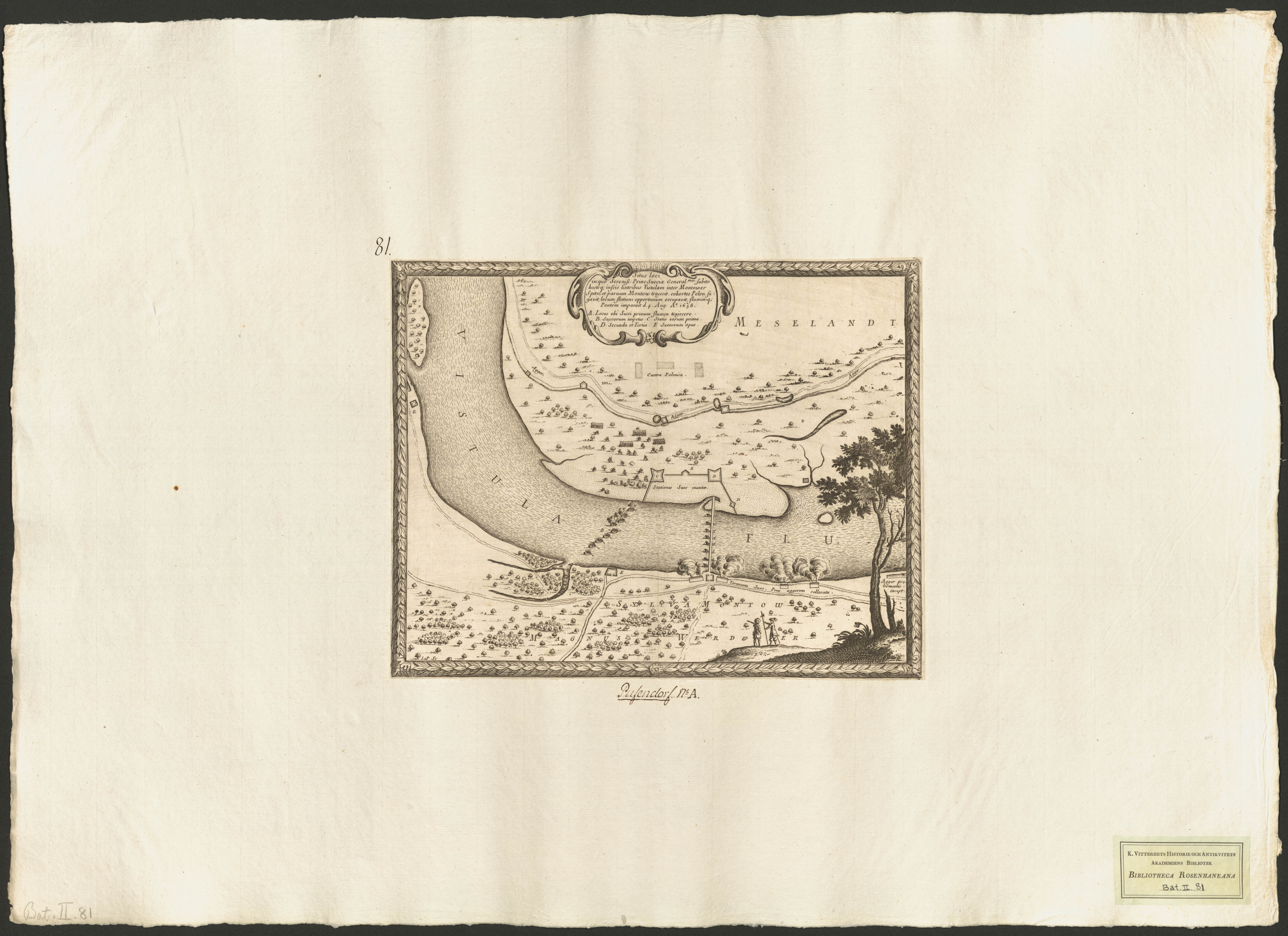 Situs loci in quo Sereniss: Princ. Sueciæ General.mus subito ... Vistulam inter Montower Spitz et paruum Montow trajecit, cohortes Polon. fugavit, ... fluminiq. Pontem imposuit d. 4. Aug: Ao 1658..[Bild]