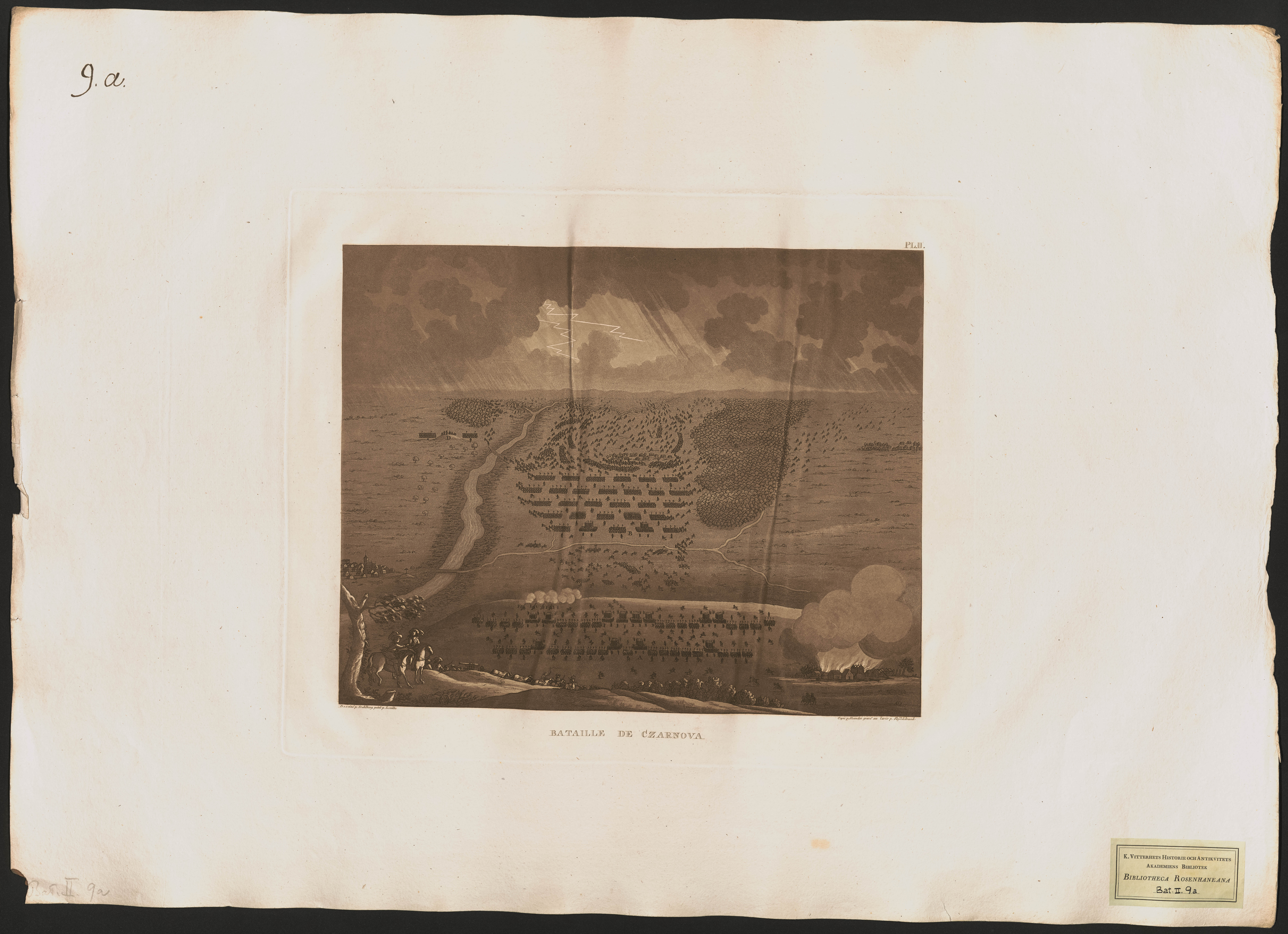 Beskrivning: 1 grafiskt bl. : Polackerna flyr in i skogarna. I förgrunden svenska hären uppställd i slagordning. T.v. Czarnova; t.h. en brinnande by. dessein p. Dahlberg peint p. Lembke. ; Copié p. Aleander. Gravé au lavis p. Skjöldebrand.
