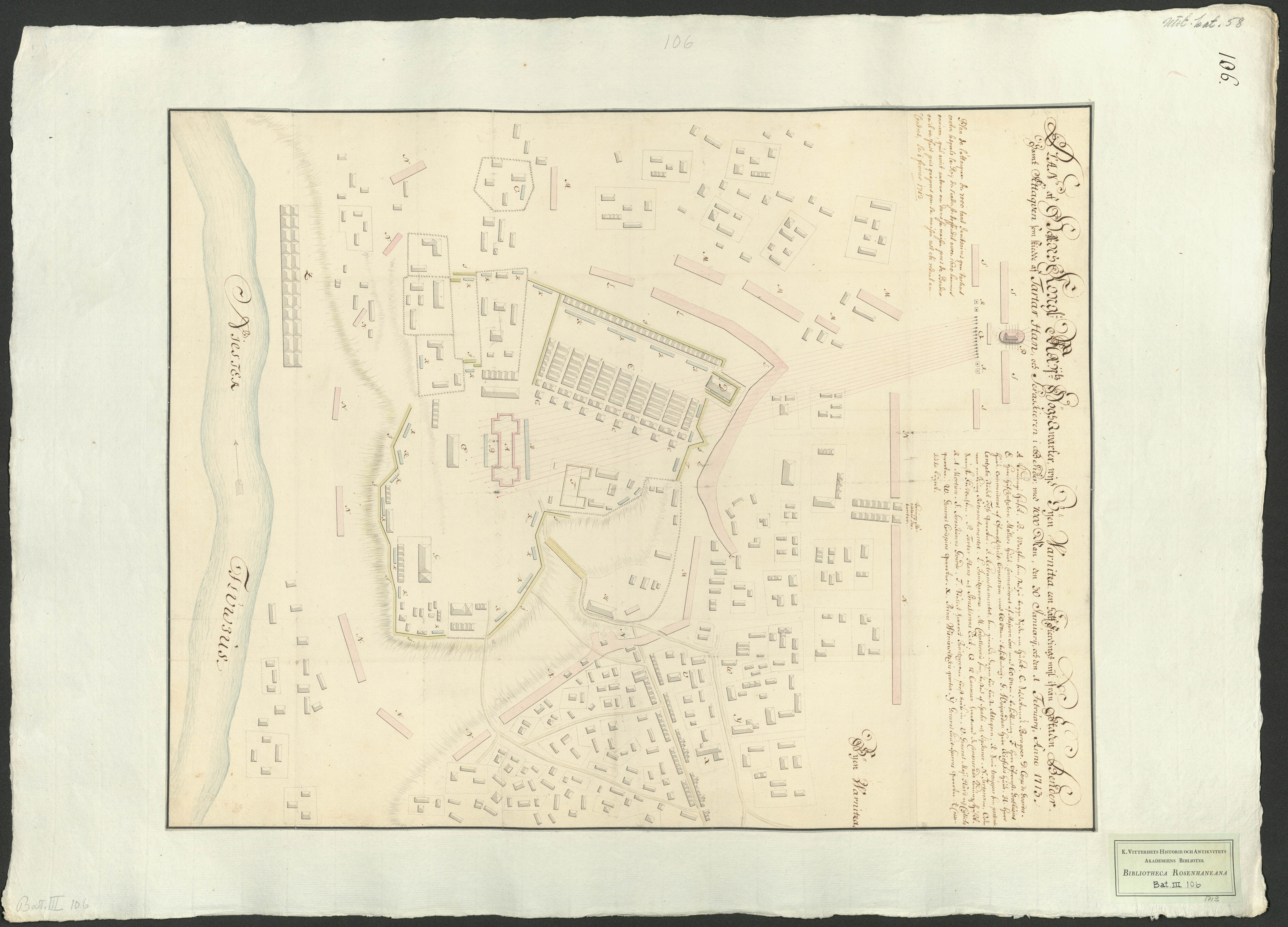 Plan af HKM hög quarter vid byn Warnitza 1/8 dels mil ifrån Bender samt attaquen som skedde d 30 januarii och d 1 febr a 1713.[Bild]